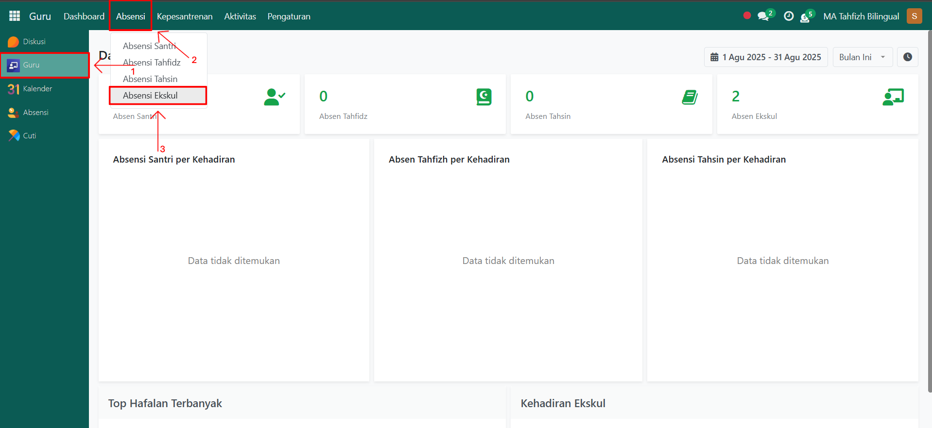 Buka modul Guru, lalu klik menu Absensi kemudian pilih submenu Absensi Ekskul.
