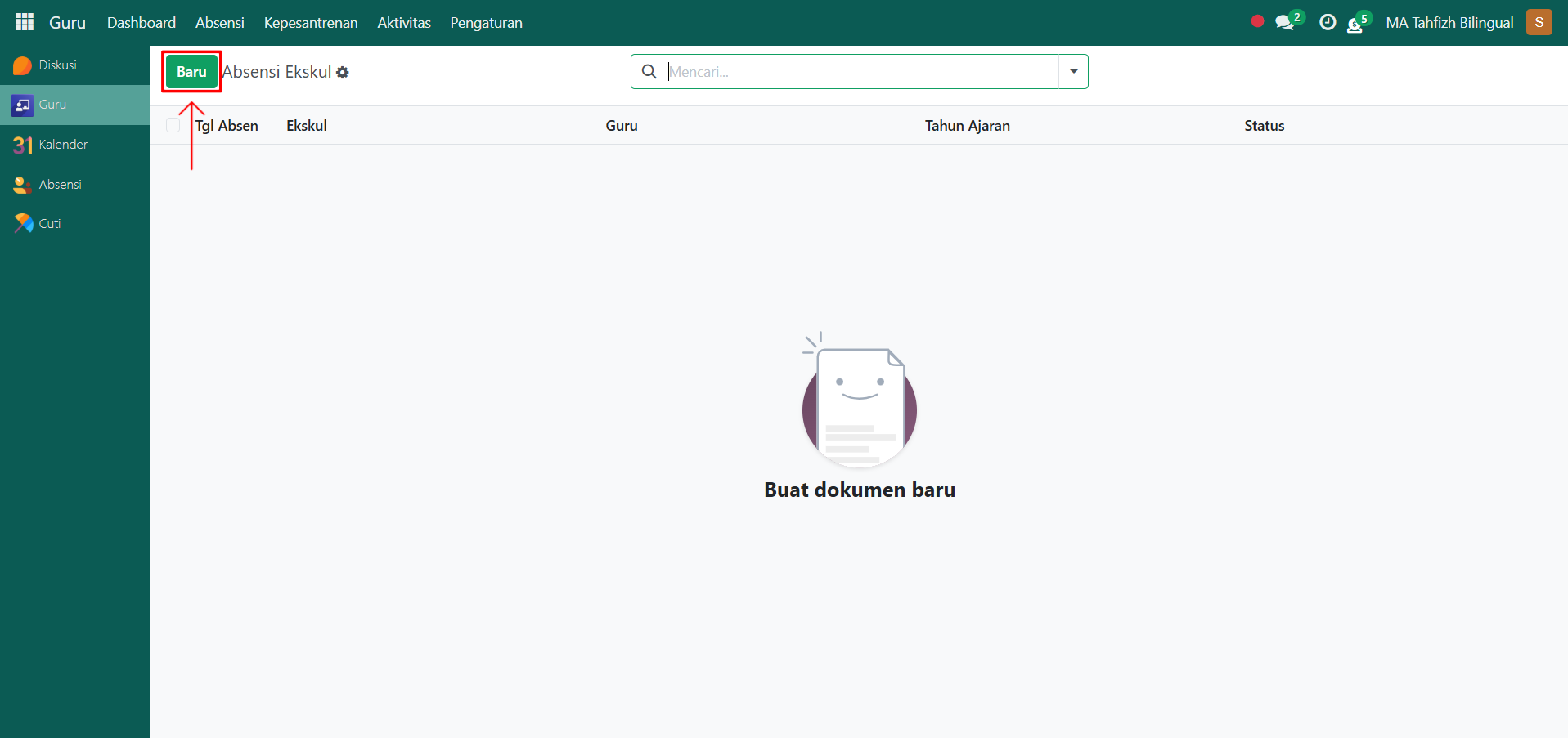 Klik tombol "Baru" untuk menambahkan absensi ekskul.
