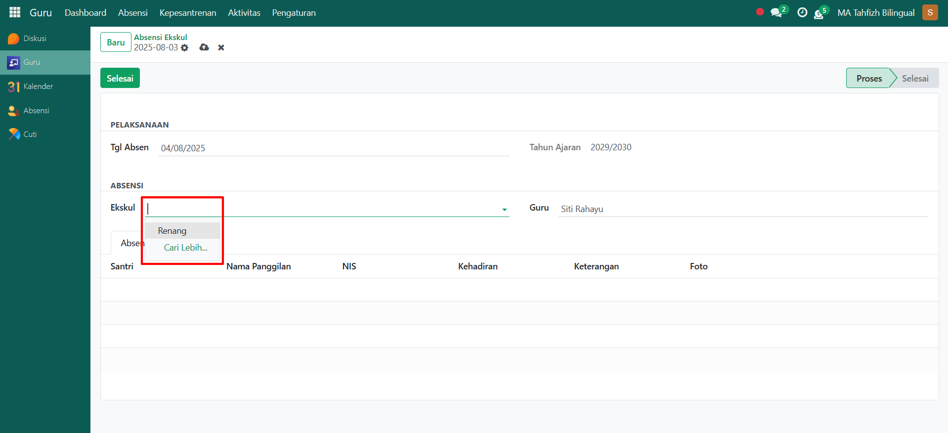 Pada Tab Absensi Ekskul, sistem akan menampilkan daftar santri yang mengikuti ekskul tersebut. Lakukan pencatatan kehadiran dengan memberi status Hadir/Izin/Alfa sesuai kondisi santri.