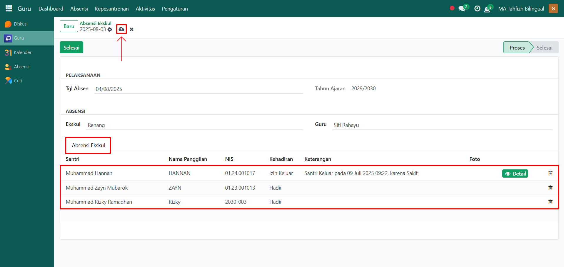 Setelah semua inputan diisi dengan benar, klik ikon Simpan di sebelah kanan ikon Gear agar data absensi ekskul tersimpan di sistem dan statusnya akan menjadi Proses.