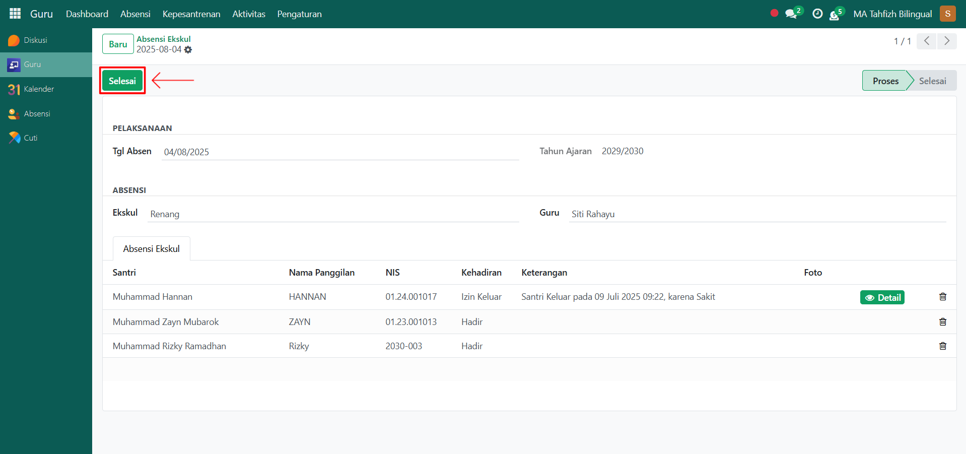 Terakhir, klik tombol "Selesai" untuk mengkonfirmasi absensi ekskul yang telah dibuat sehingga statusnya menjadi Selesai.