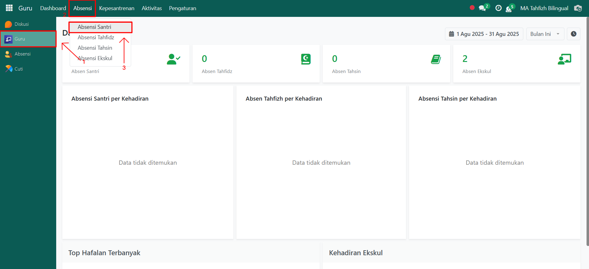 Buka modul Guru, lalu klik menu Absensi kemudian pilih submenu Absensi Santri.
