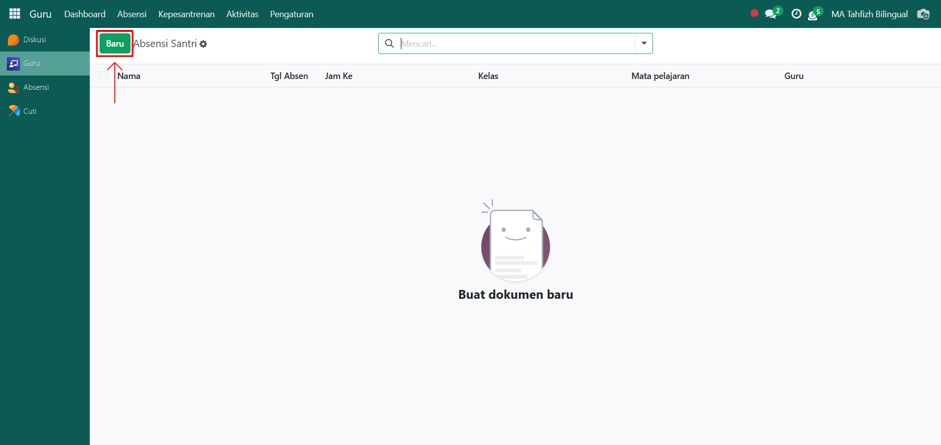 Klik tombol "Baru" untuk membuat absensi santri.