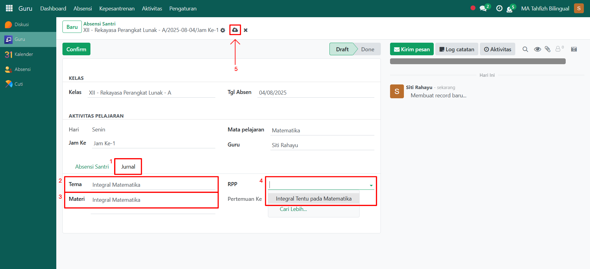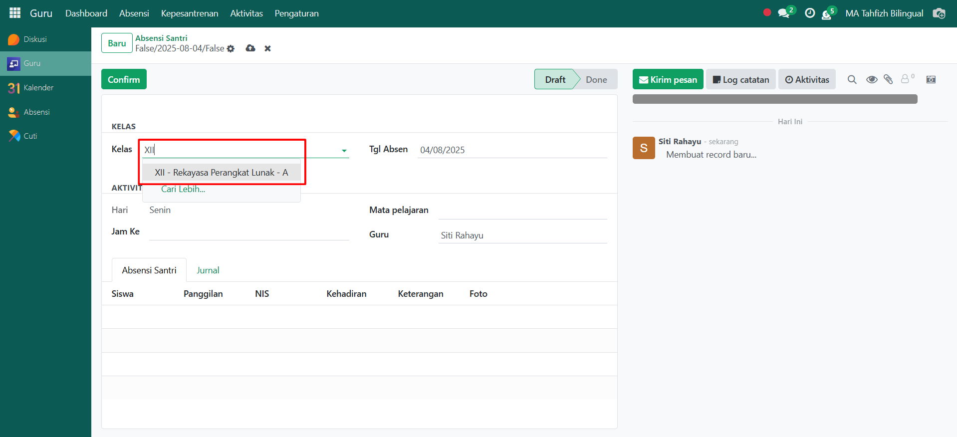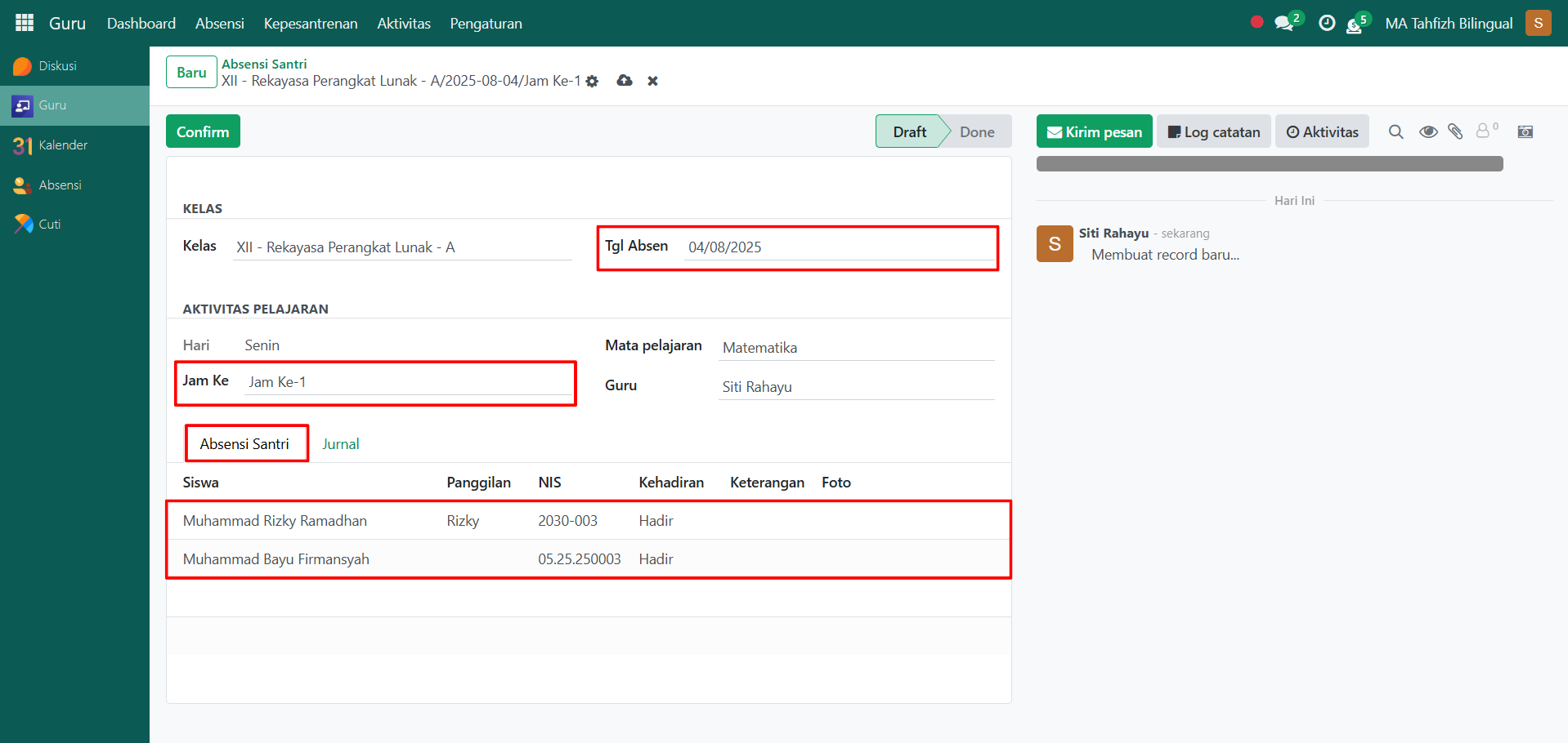 Setelah semua inputan diisi dengan benar, klik icon Simpan di sebelah kanan icon Gear agar data absensi santri tersimpan di sistem dan statusnya akan menjadi Draft.