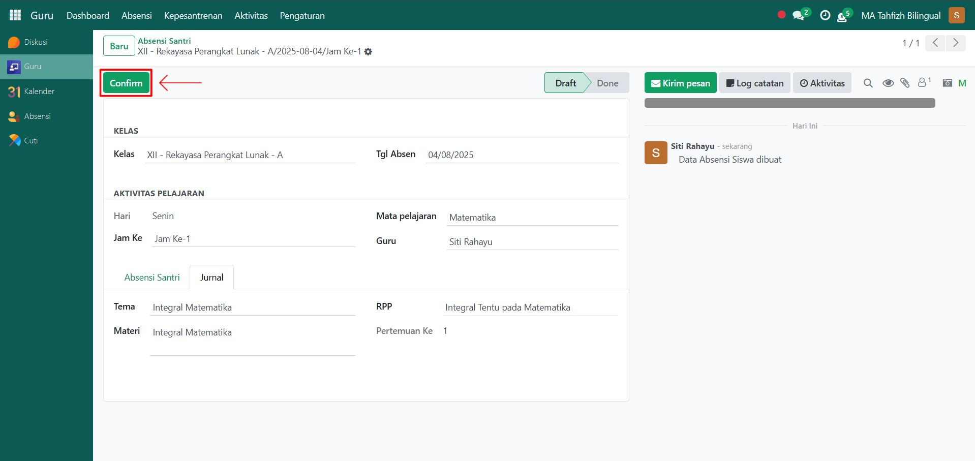 Klik tombol "Confirm" untuk mengkonfirmasi absensi santri yang telah dibuat sehingga statusnya menjadi Done.