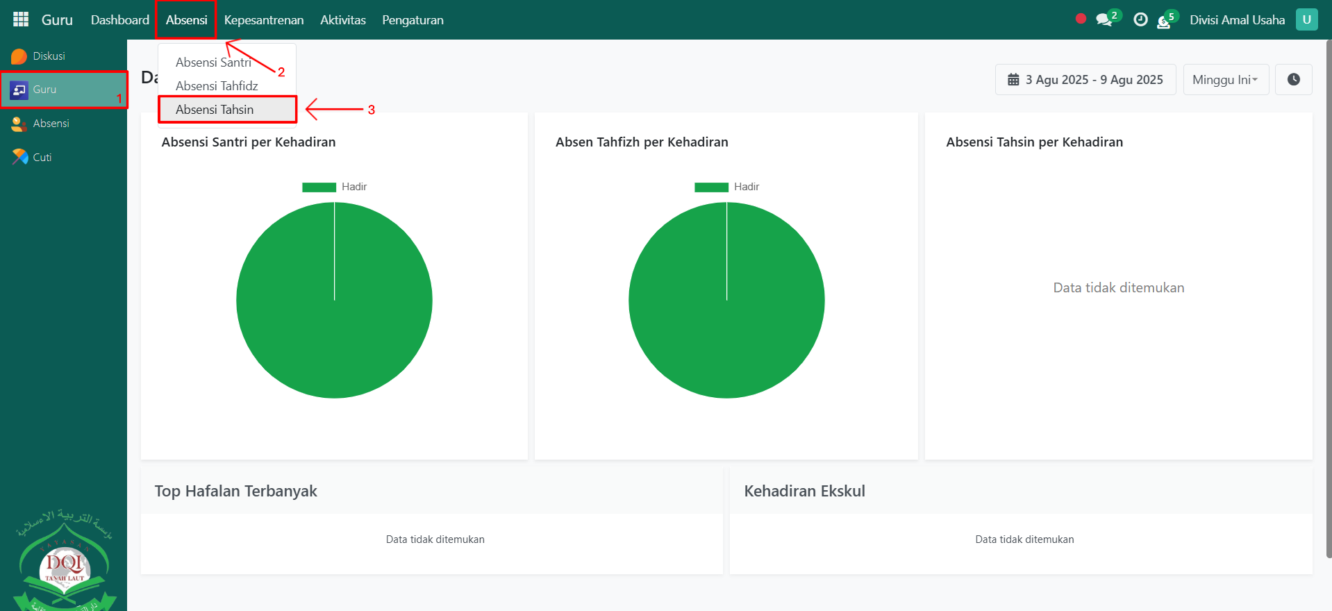Buka modul Guru, lalu klik menu Absensi kemudian pilih submenu Absensi Tahsin.