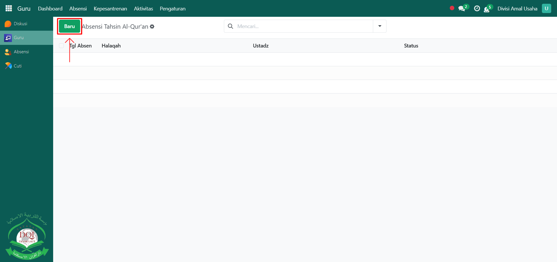Klik tombol "Baru" untuk membuat absensi tahsin baru.