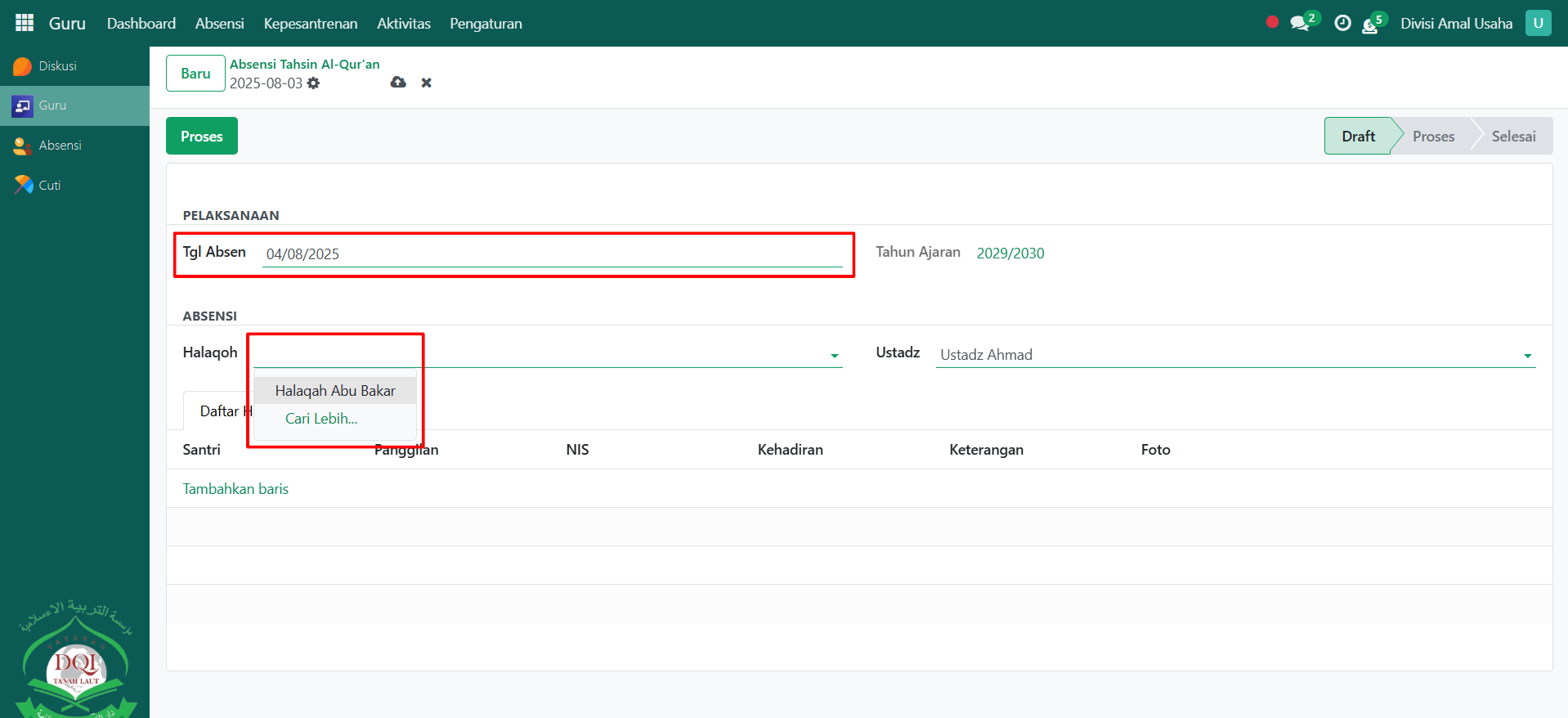 Akan tampil halaman form Absensi Tahsin. Pada form ini, isi Tanggal Absen, lalu pilih Halaqah yang dibina oleh guru Qur’an yang sedang login. Pada field Ustadz (otomatis akan terisi sesuai guru qur'an yang sedang login).