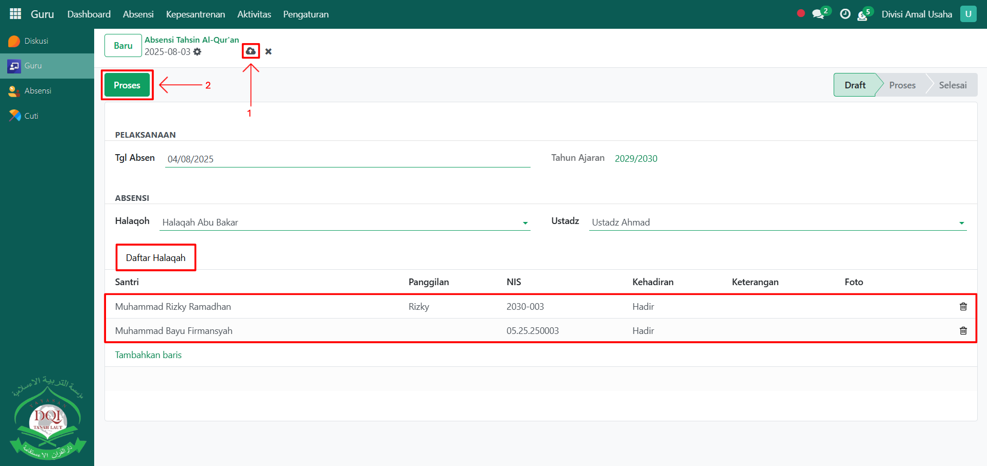 Setelah semua inputan diisi dengan benar, klik icon Simpan di sebelah kanan icon Gear agar data absensi tahsin tersimpan di sistem dan statusnya akan menjadi Draft, lalu klik tombol "Proses" untuk memproses absensi.