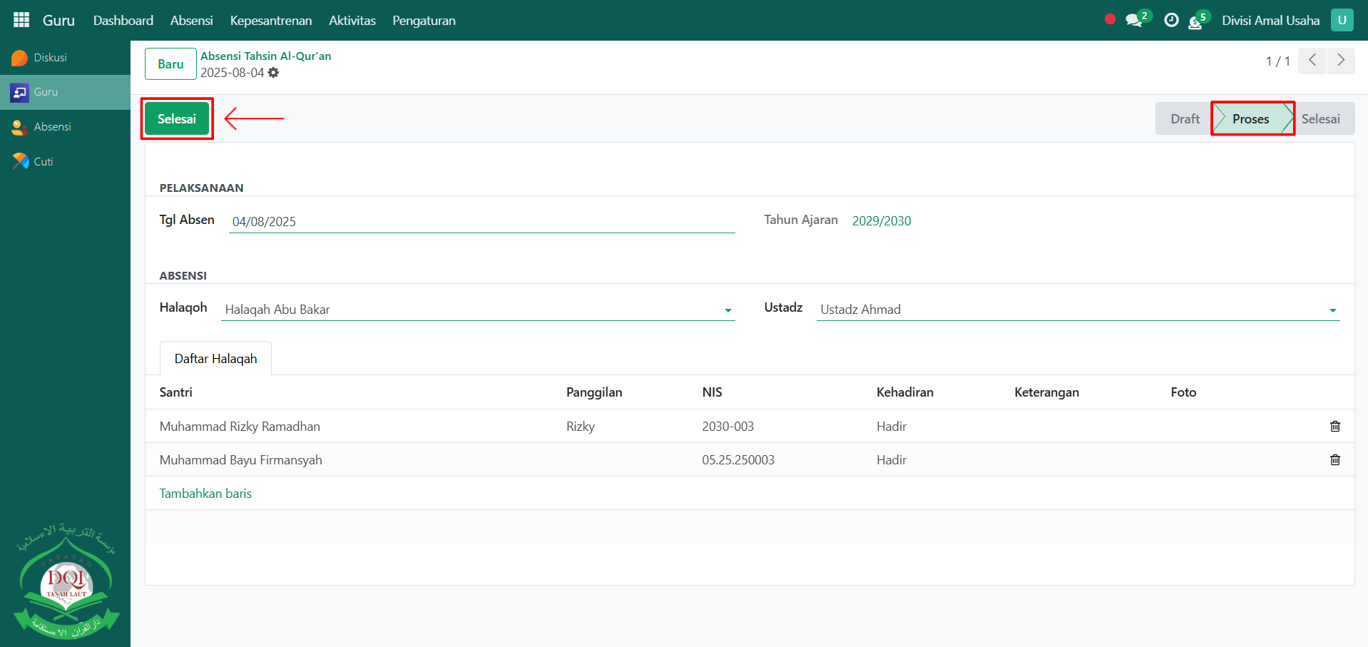 Terakhir, setelah proses absensi selesai, klik tombol "Selesai" untuk mengonfirmasi bahwa absensi tahsin sudah final.