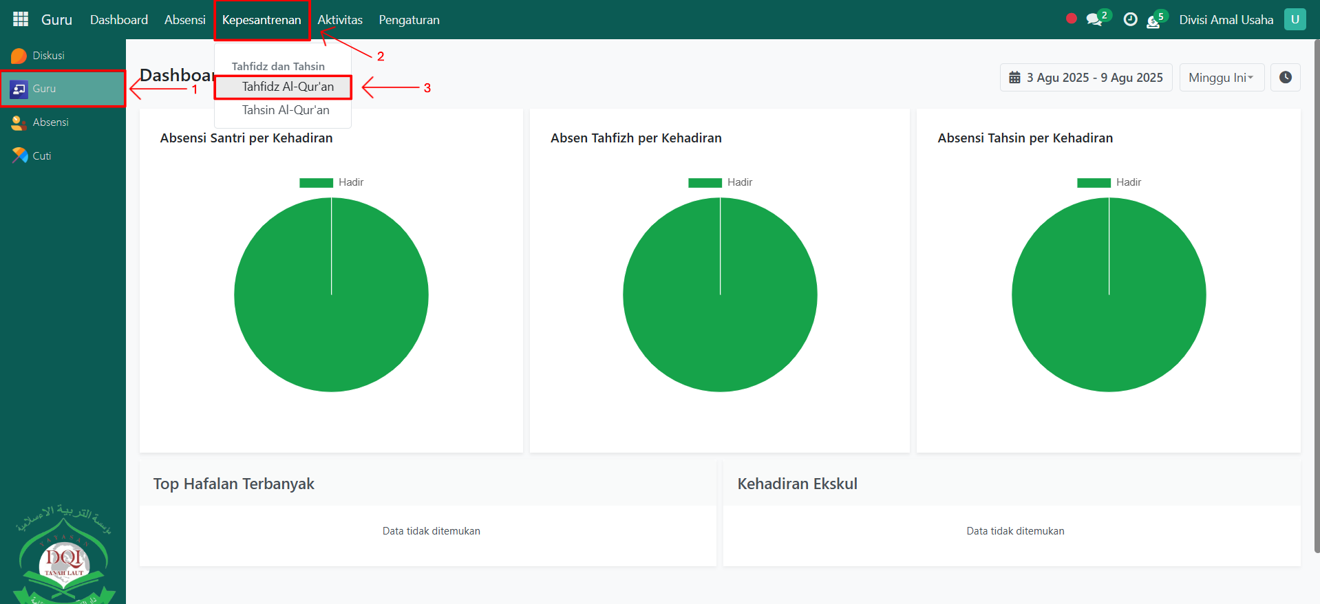 Buka modul Guru, lalu klik menu Kepesantrenan kemudian pilih submenu Tahfidz Al-Qur’an.
