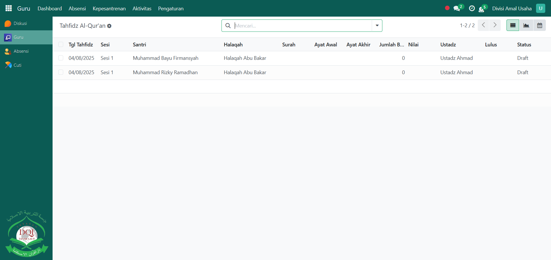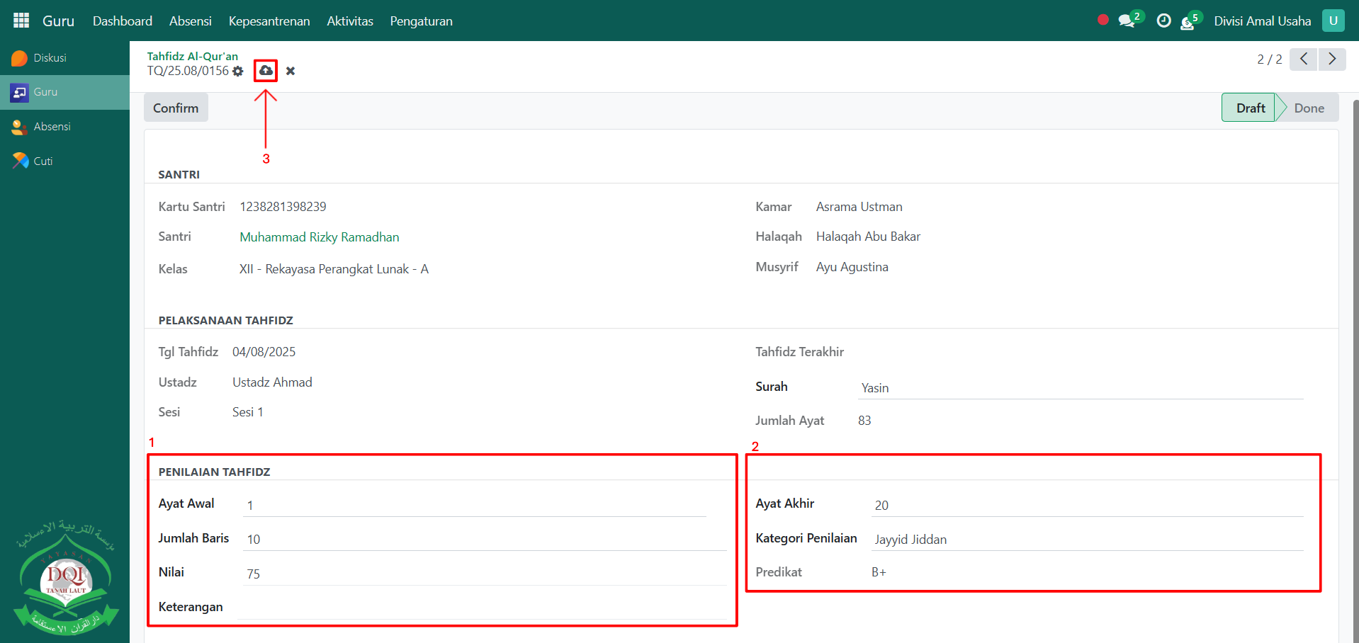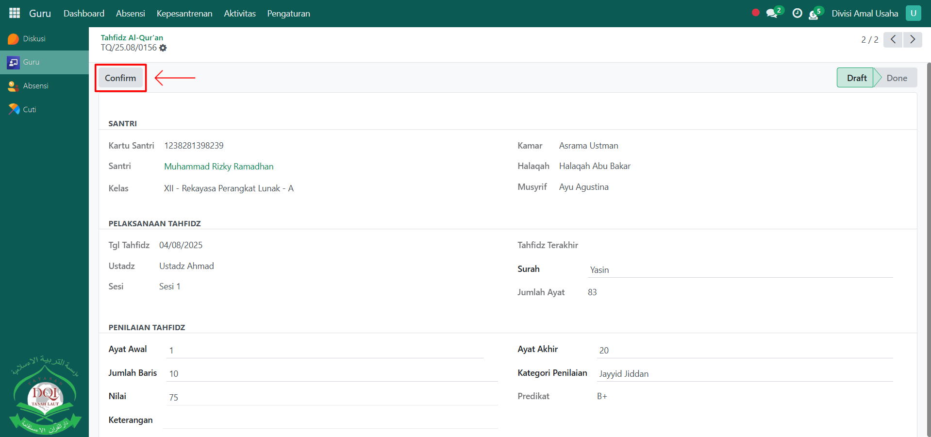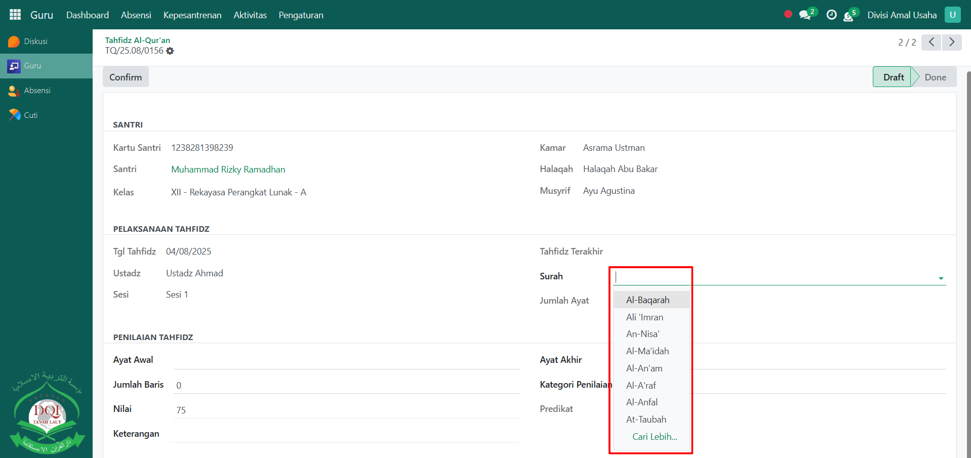 Berikut adalah langkah-langkah untuk melakukan penilaian tahfidz al-qur'an pada Odoo Pesantren sebagai guru qur'an.