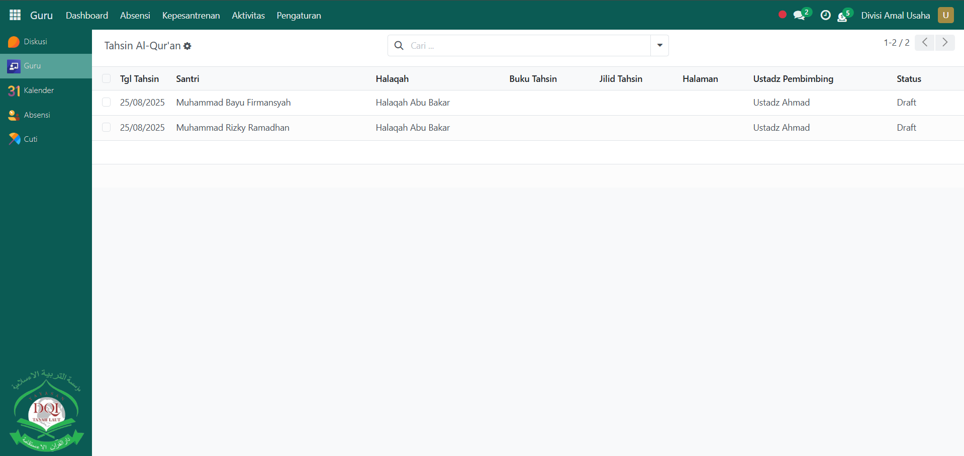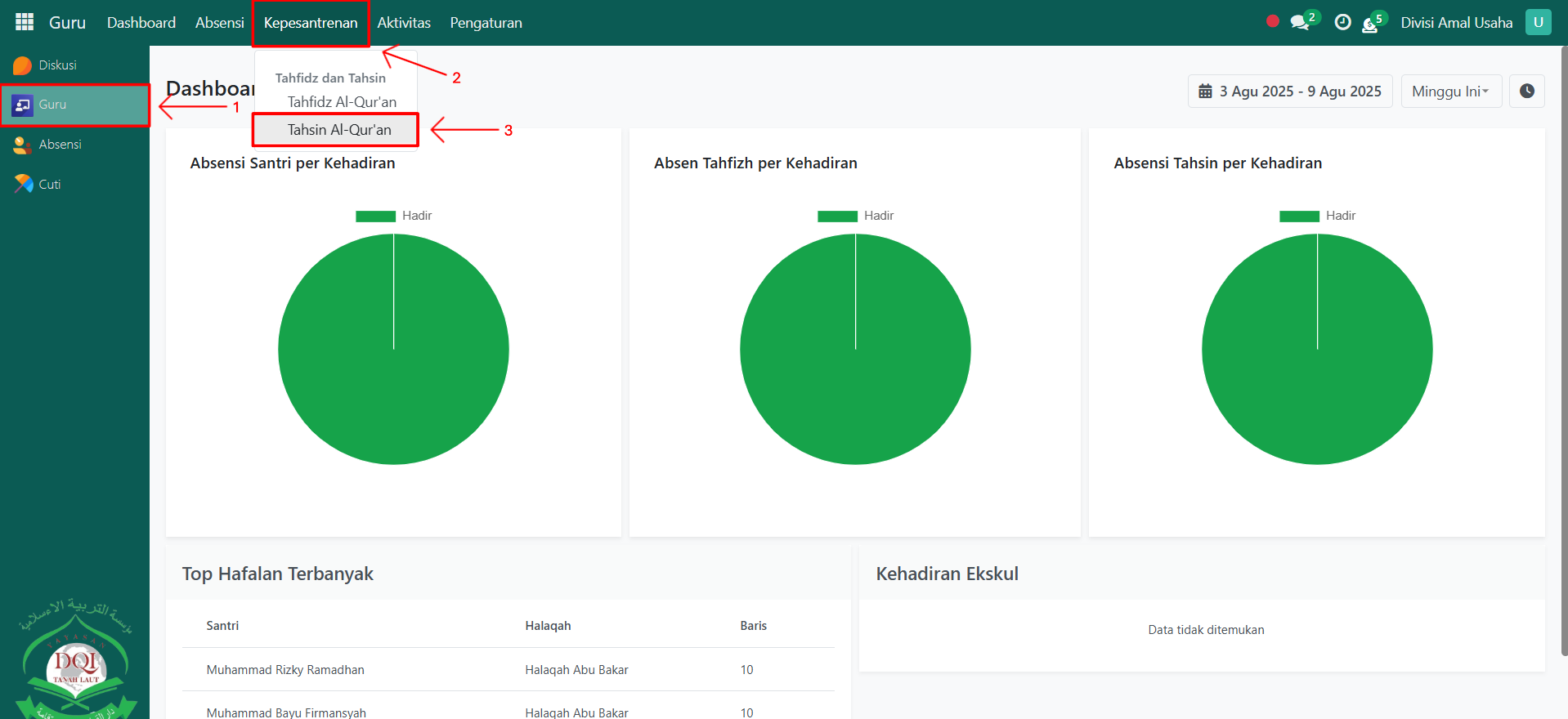 Buka modul Guru, lalu klik menu Kepesantrenan kemudian pilih submenu Tahsin Al-Qur’an.