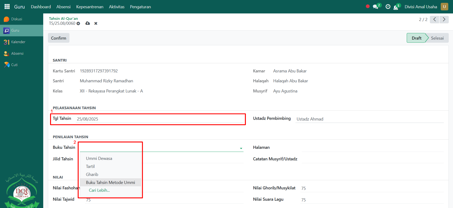 Berikut adalah langkah-langkah untuk melakukan penilaian tahsin al-qur'an pada Odoo Pesantren sebagai guru qur'an.