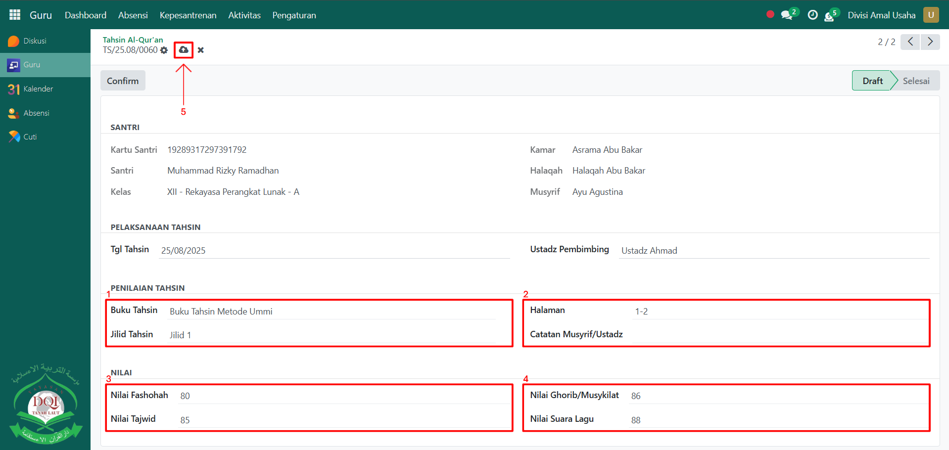 Setelah semua inputan diisi dengan benar, klik icon Simpan di sebelah kanan icon Gear agar data penilaian tahsin tersimpan di sistem dengan status Draft.