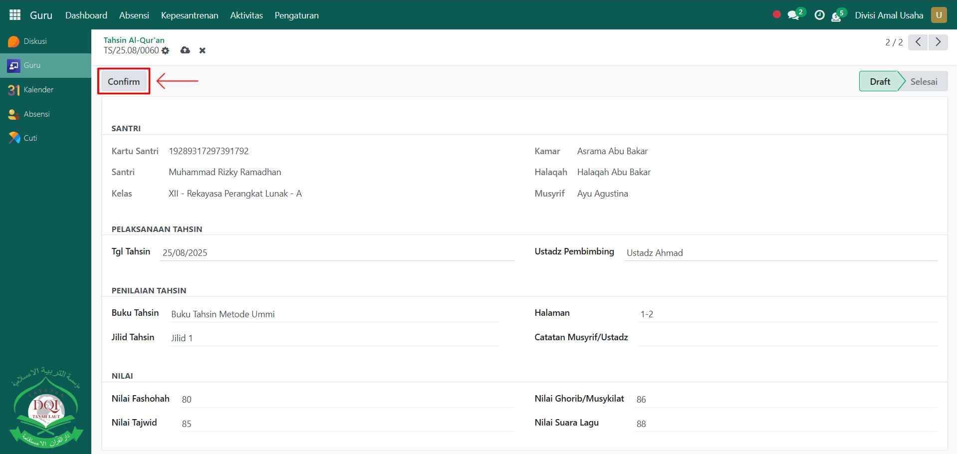 Klik tombol "Confirm" untuk mengonfirmasi bahwa proses penilaian tahsin sudah selesai dan statusnya menjadi Selesai.