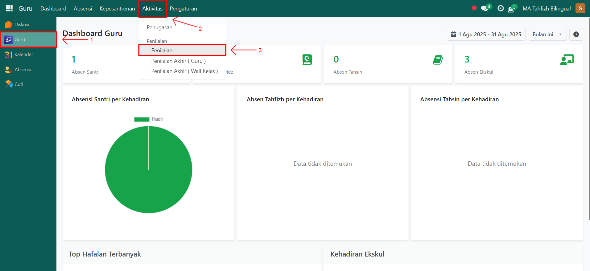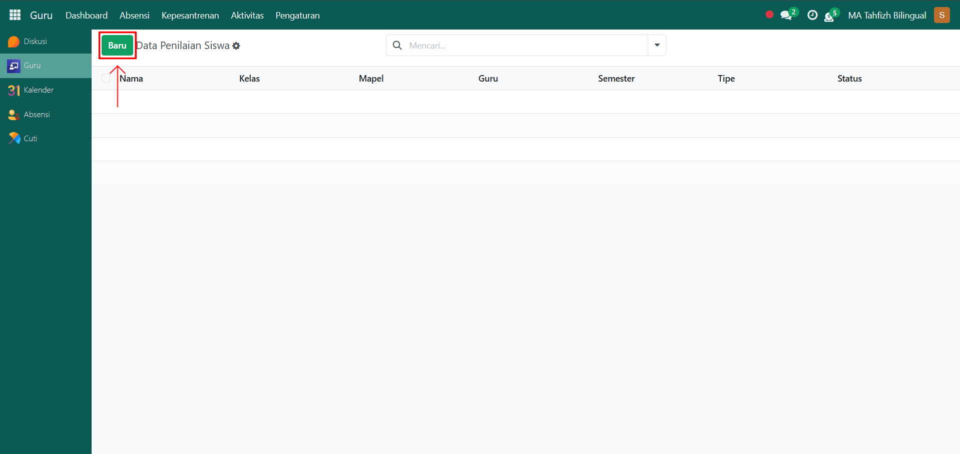 Buka modul Guru, lalu klik menu Aktivitas kemudian pilih submenu Penilaian.