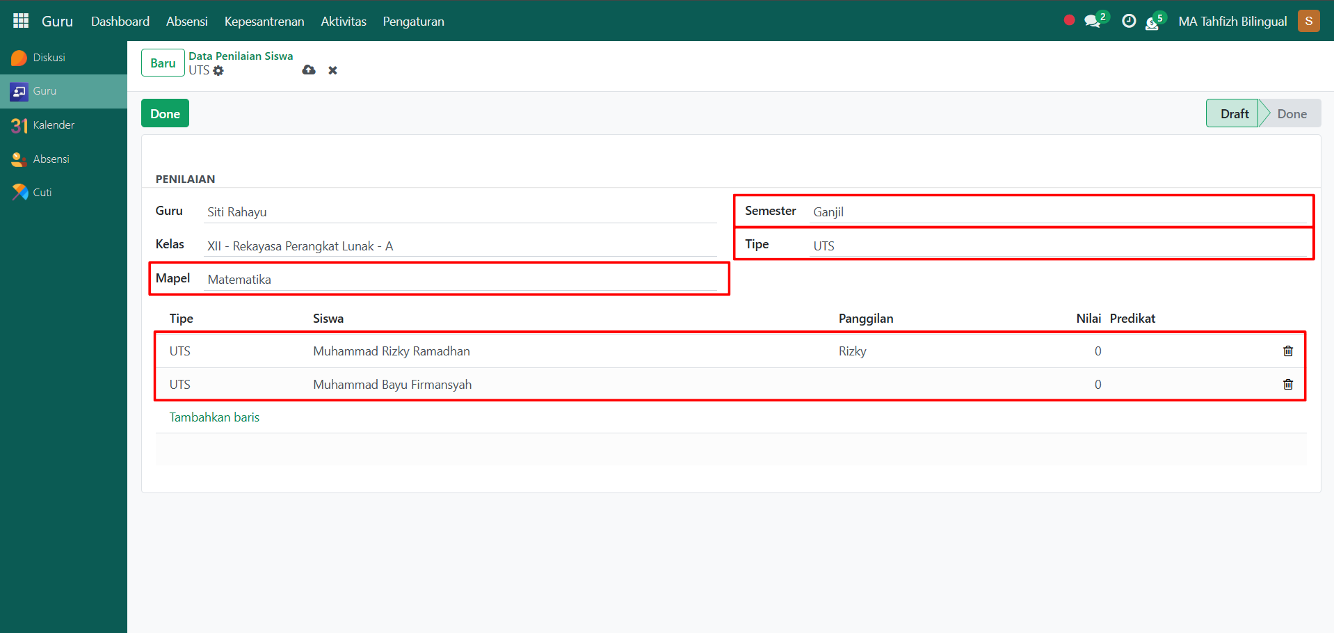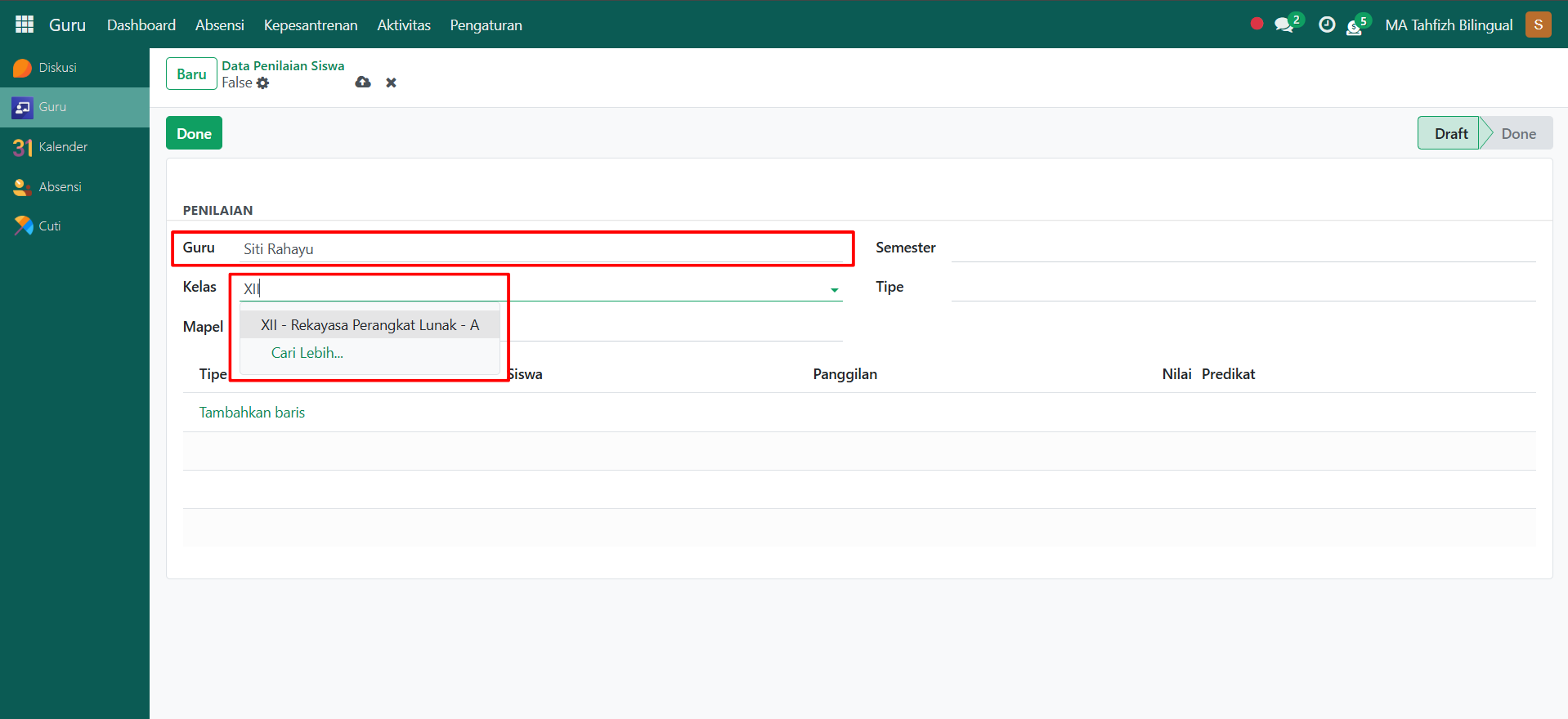 Berikut adalah langkah-langkah untuk melakukan Penilaian pada Odoo Pesantren sebagai guru akademik.