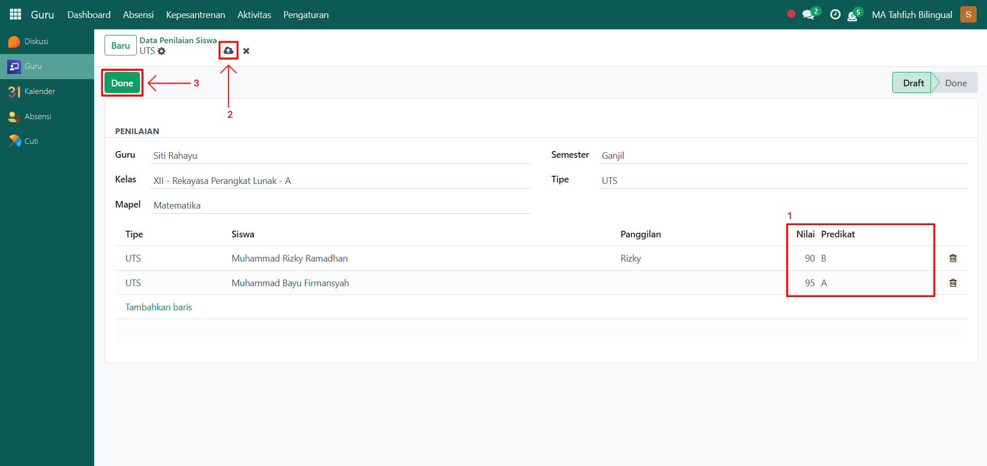 Setelah semua inputan diisi dengan benar, klik icon Simpan di sebelah kanan icon Gear agar data penilaian tersimpan di sistem dengan status Draft. Klik tombol "Done" untuk mengonfirmasi bahwa proses penilaian sudah selesai dan statusnya akan menjadi Done.