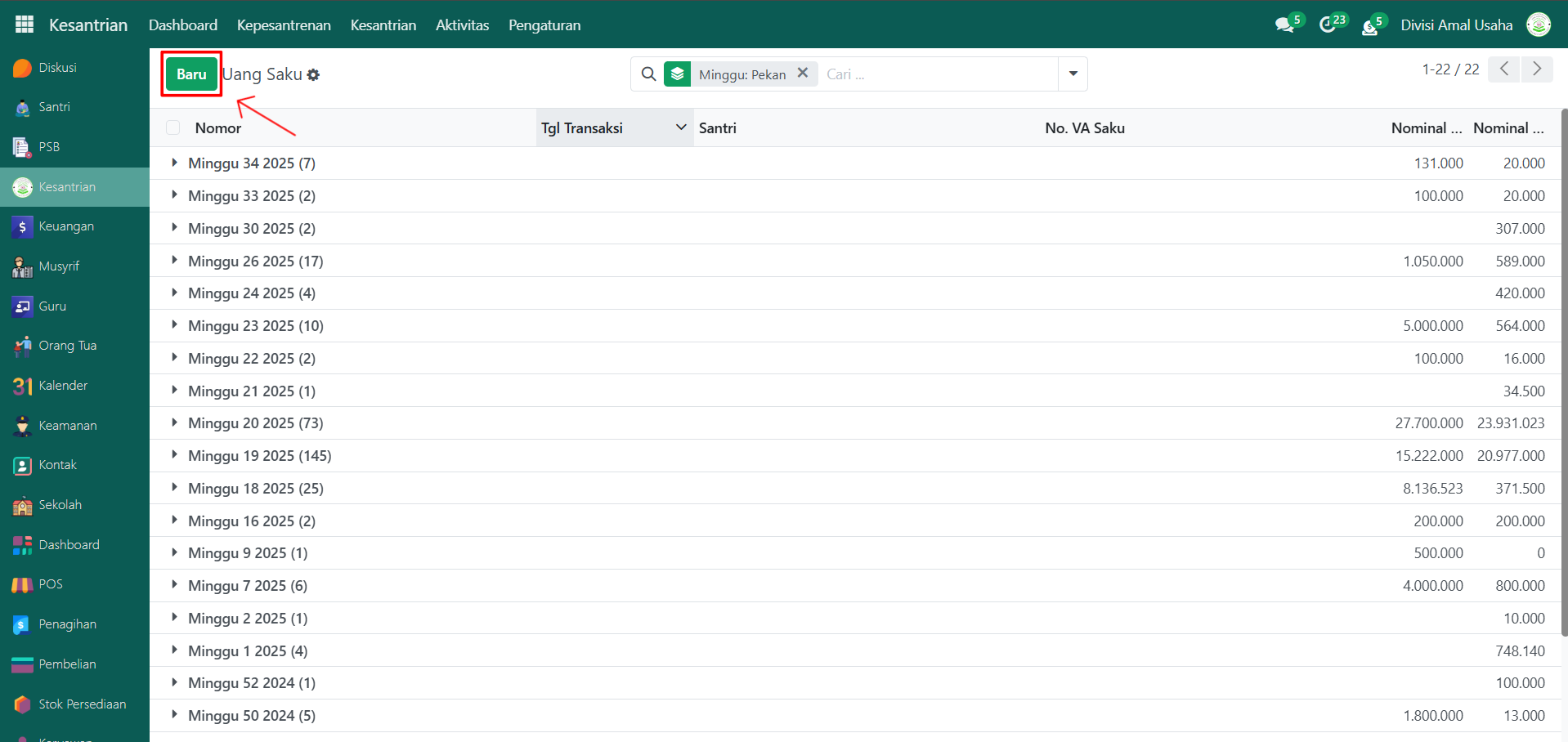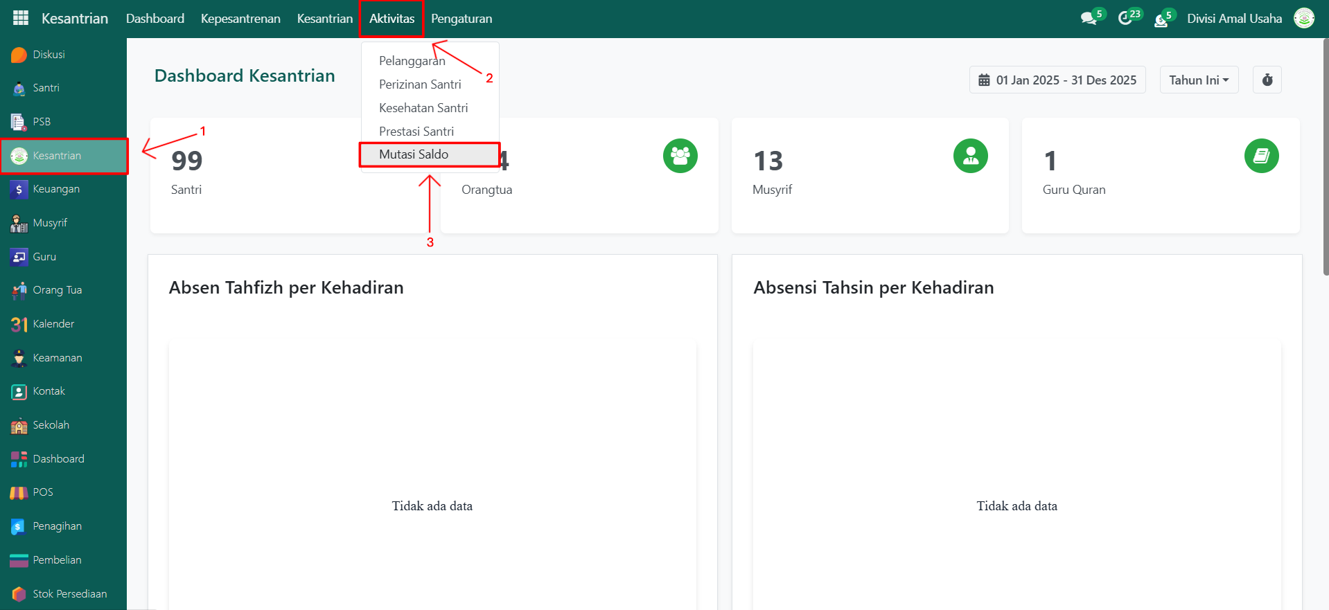 Buka modul Kesantrian, lalu klik menu Aktivitas kemudian pilih submenu Mutasi Saldo.