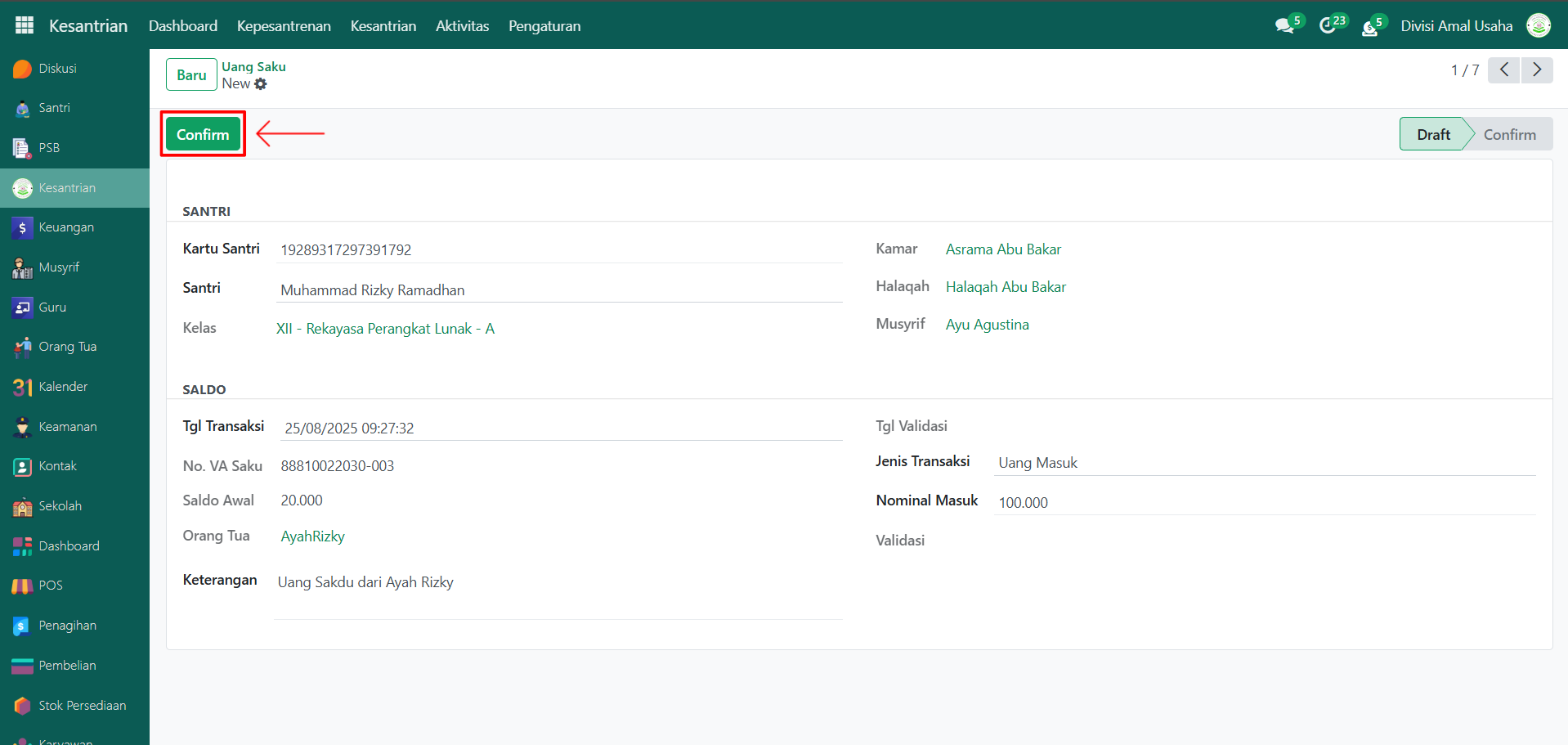 Setelah status mutasi saldo menjadi Confirm, sistem akan langsung memproses uang masuk/keluar dari mutasi saldo tersebut ke Dompet Santri.