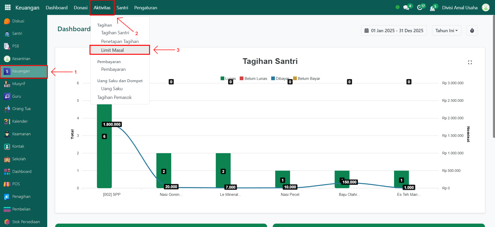 Buka modul Keuangan, lalu klik menu Aktivitas kemudian pilih submenu Limit Masal.