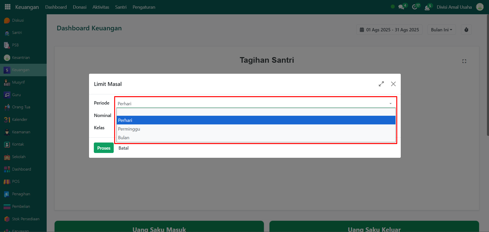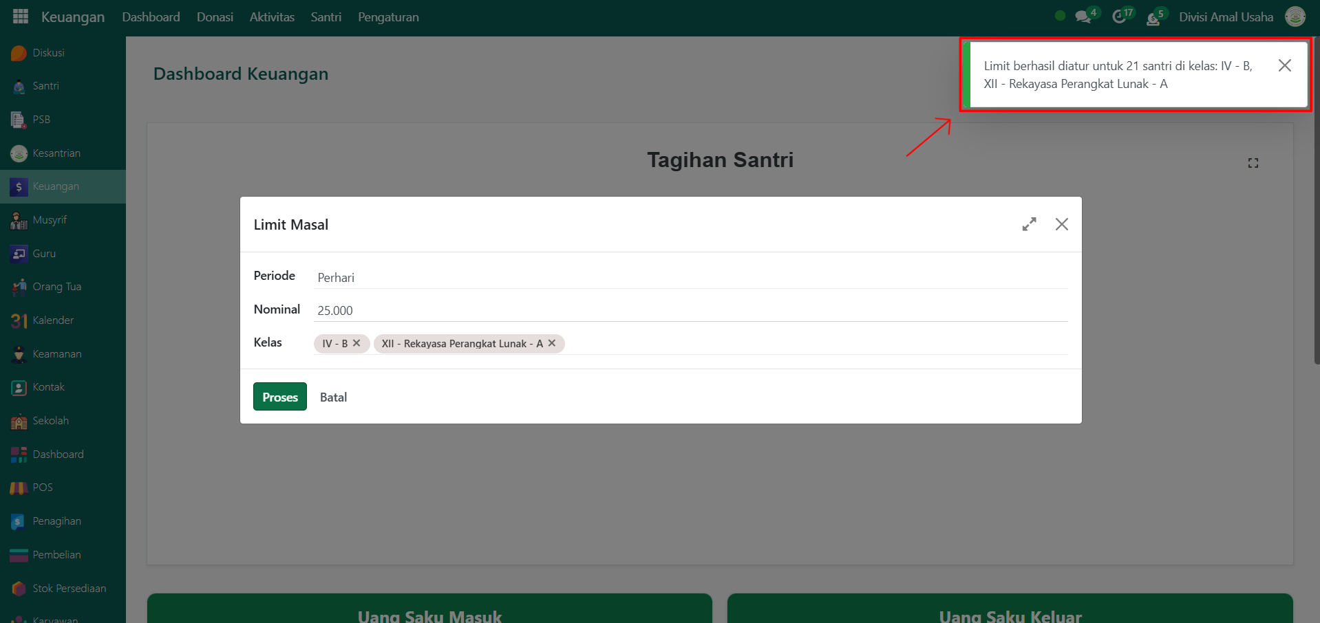Sistem akan secara otomatis menerapkan batas saldo pada semua santri sesuai kelas dan periode yang dipilih.