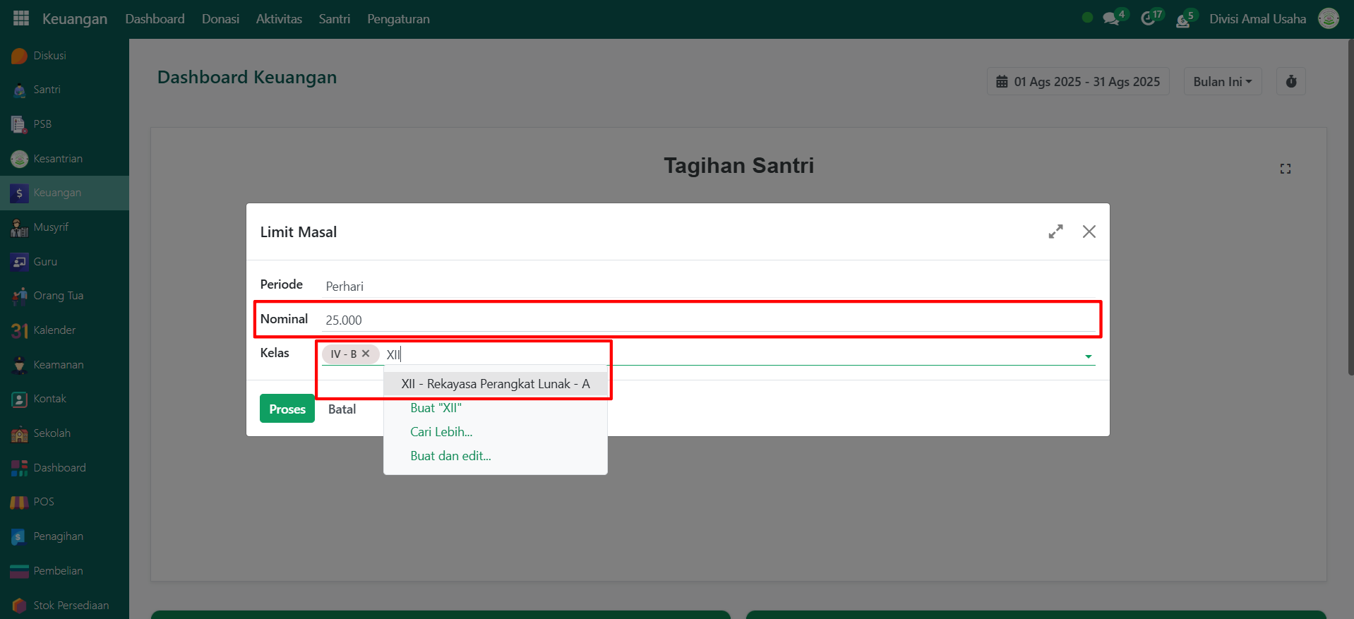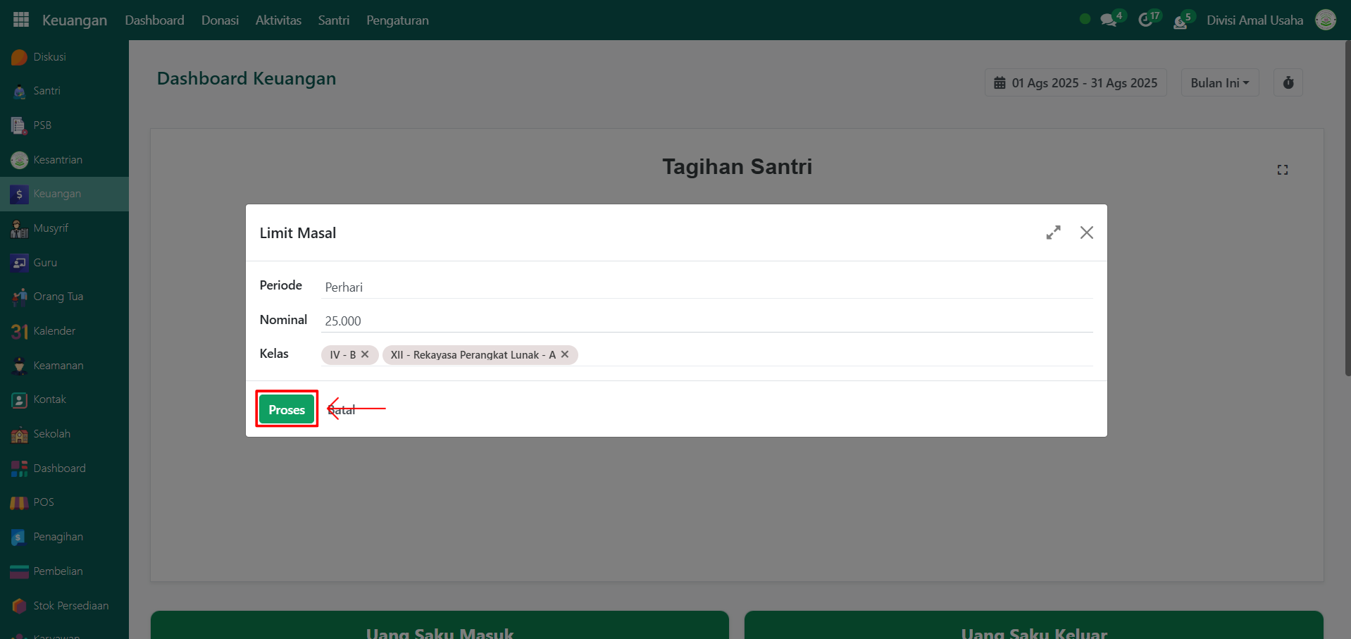 Masukkan Nominal Limit yang ingin diterapkan, kemudian pilih Kelas yang santrinya akan dikenakan limit saldo secara masal.