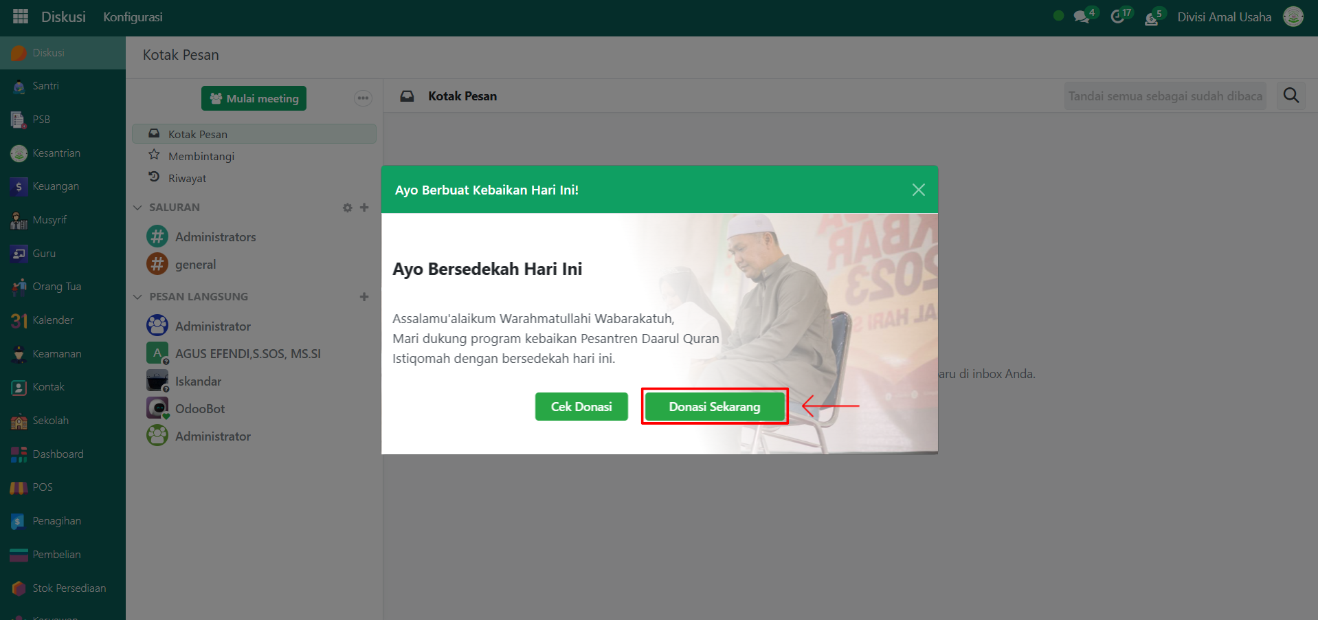 Berikut adalah langkah-langkah untuk melakukan pencatatan donasi pada Odoo Pesantren.