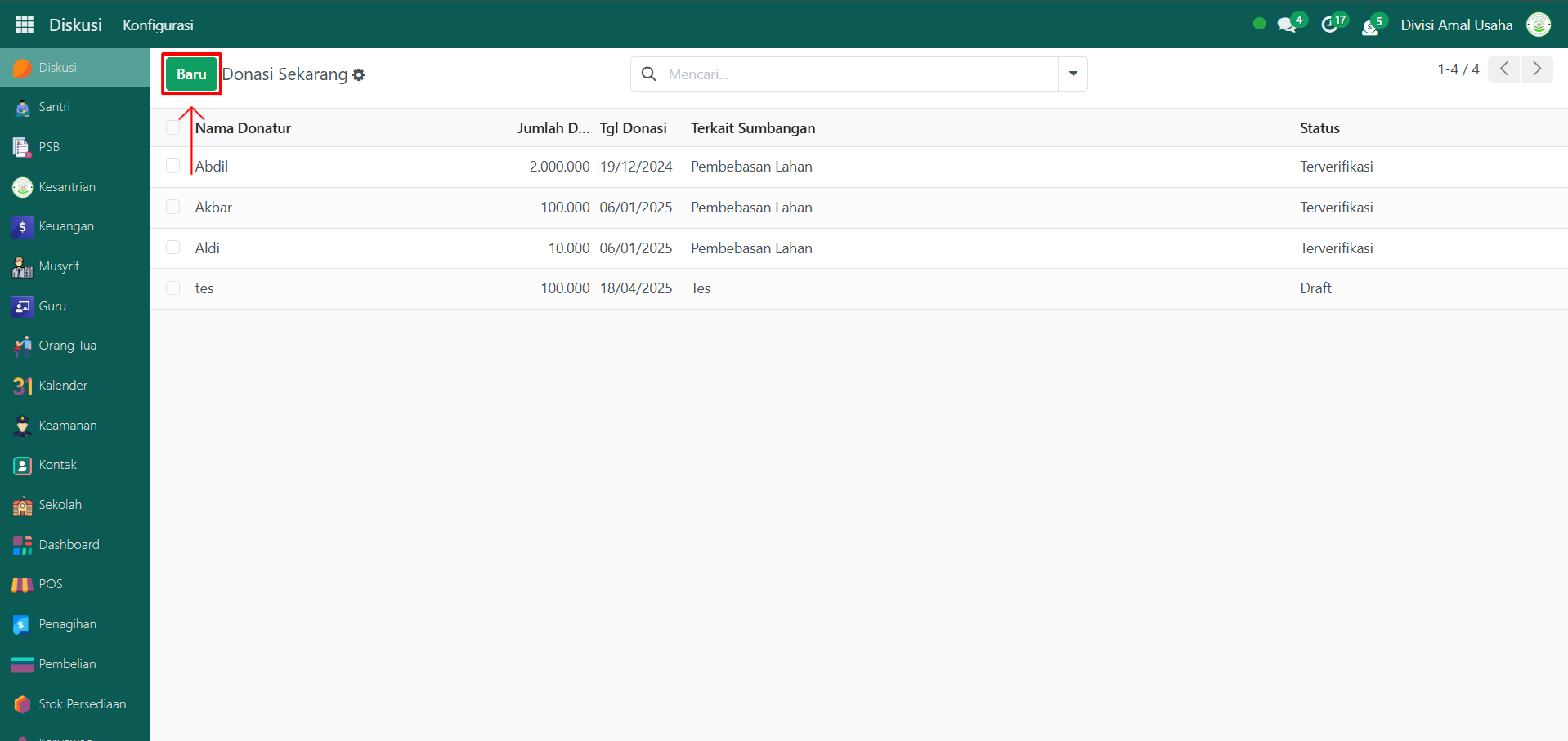 Klik tombol "Baru" untuk melakukan pencatatan donasi baru.