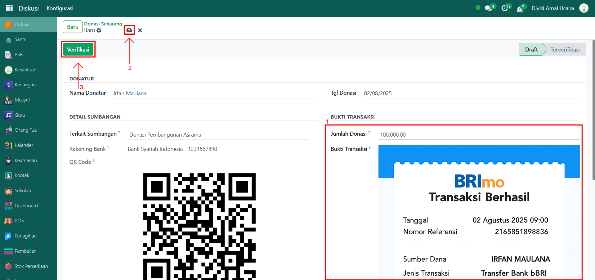 Berikutnya, masukkan jumlah donasi yang ingin didonasikan serta bukti dari transaksinya. Setelah semua inputan diisi dengan benar, klik ikon Simpan di sebelah kanan ikon Gear dan status donasi akan menjadi Draft. Klik tombol "Verifikasi" untuk menverifikasi data donasi.