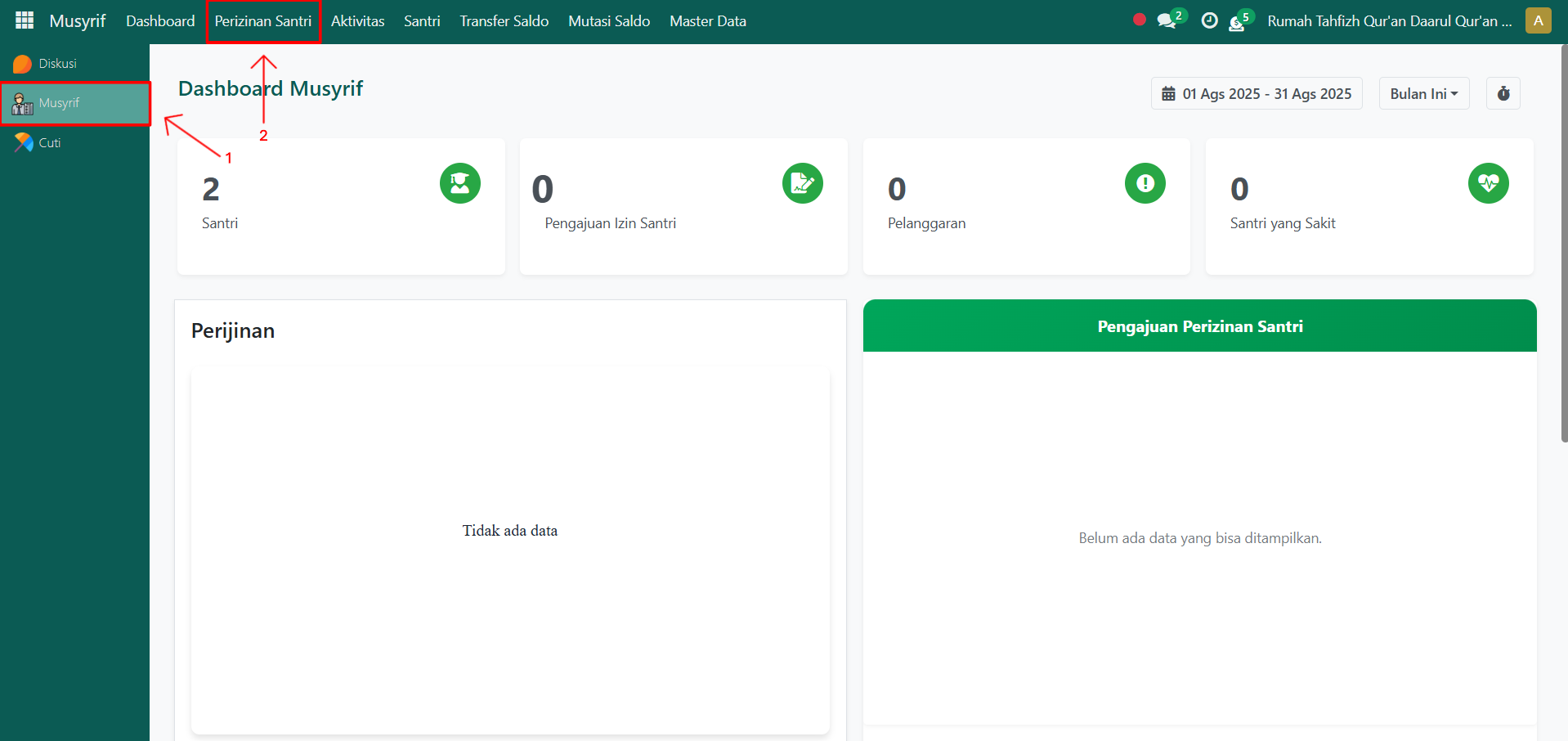 Buka modul Musyrif, lalu klik menu Perizinan Santri.