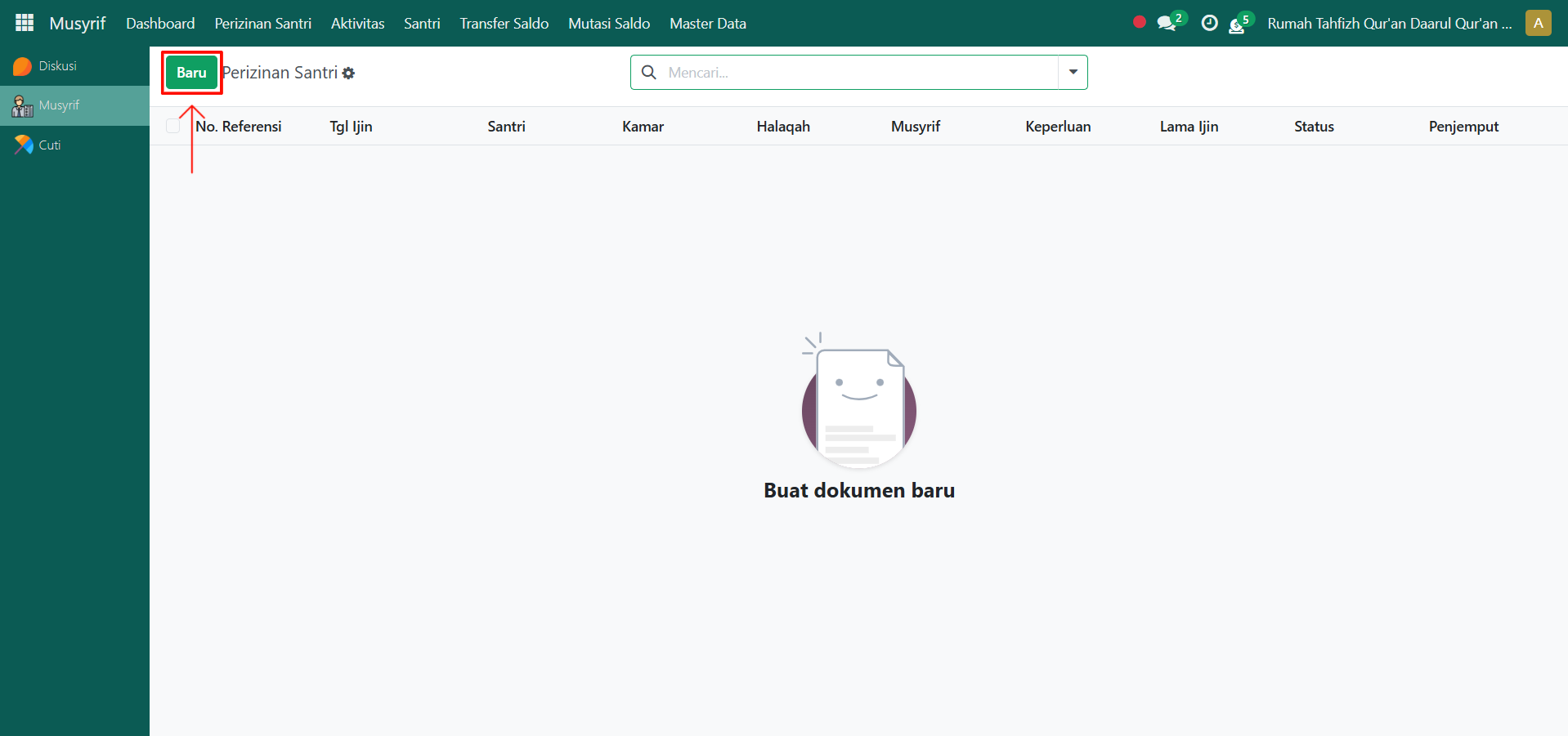Berikut adalah langkah-langkah untuk membuat/mengajukan perizinan santri pada Odoo Pesantren sebagai musyrif.