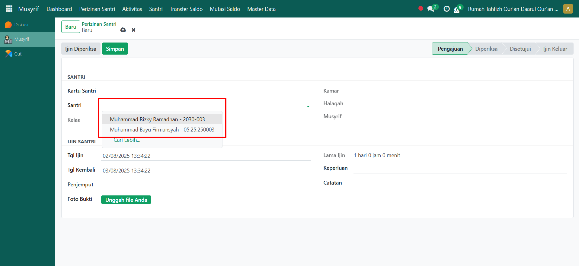Setelah semua data diisi, klik tombol "Simpan" untuk menyimpan perizinan santri. Status perizinan akan otomatis menjadi Pengajuan.