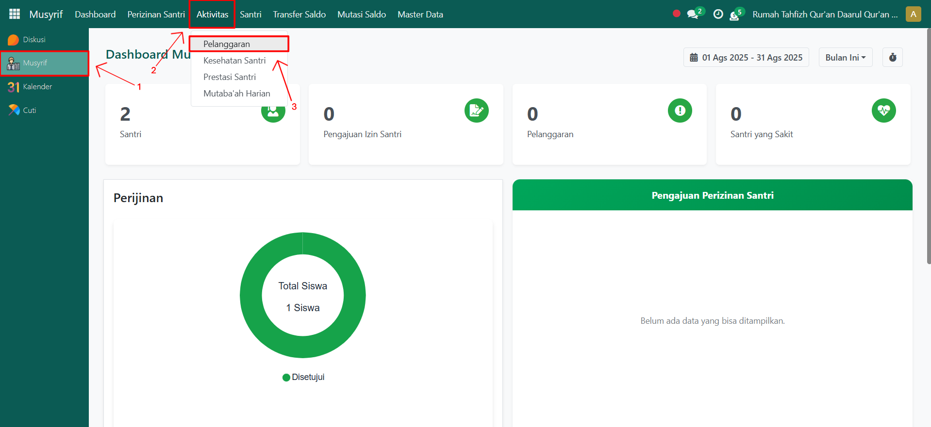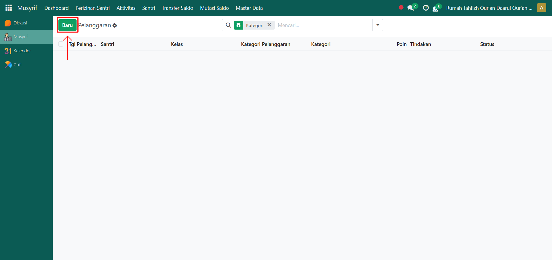 Buka modul Musyrif, lalu klik menu Aktivitas kemudian pilih submenu Pelanggaran.