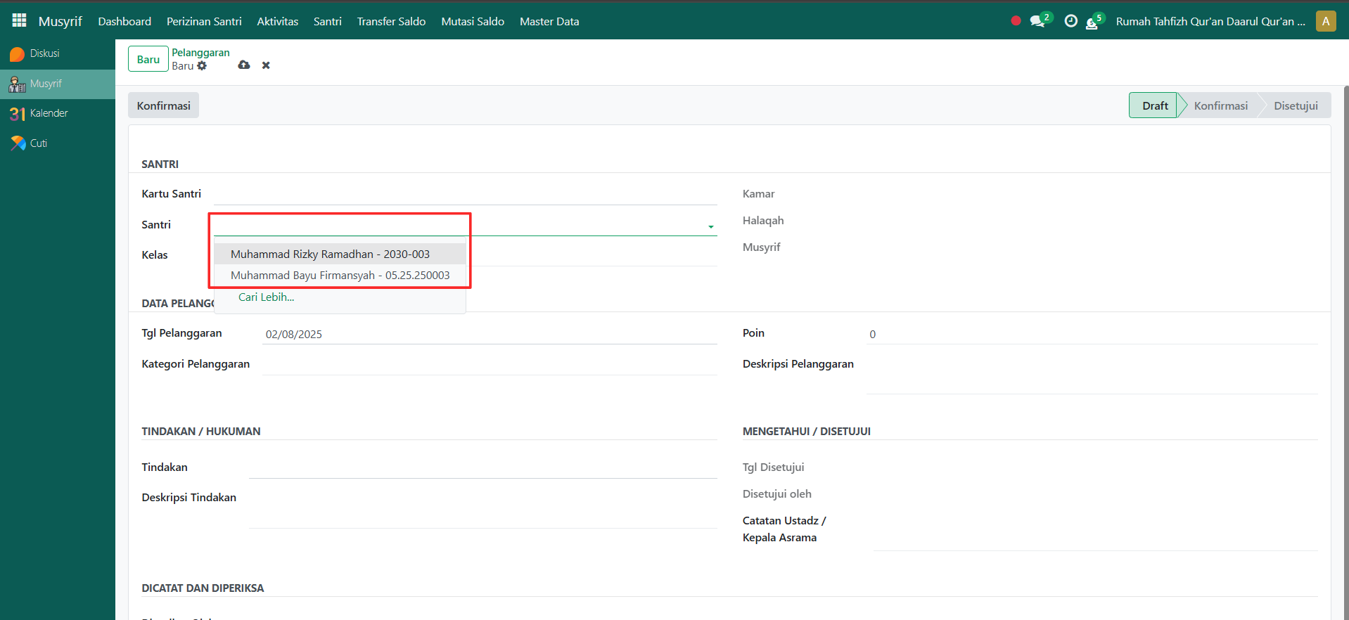 Pelanggaran Santri digunakan untuk mencatat setiap pelanggaran yang dilakukan santri di asrama. Dengan fitur ini, musyrif bisa langsung memilih santri yang melanggar, mengisi kategori pelanggaran, poin, serta tindakan disipliner yang diberikan.