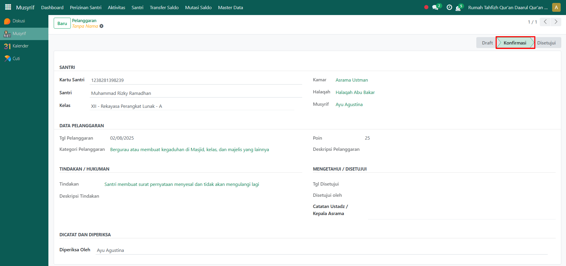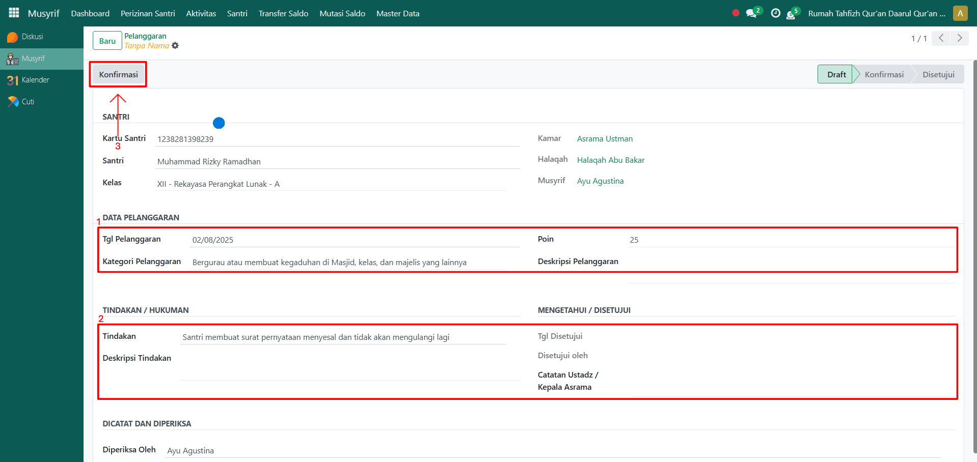 Setelah semua data diisi, klik tombol "Konfirmasi" untuk menyimpan dan mengonfirmasi catatan pelanggaran.