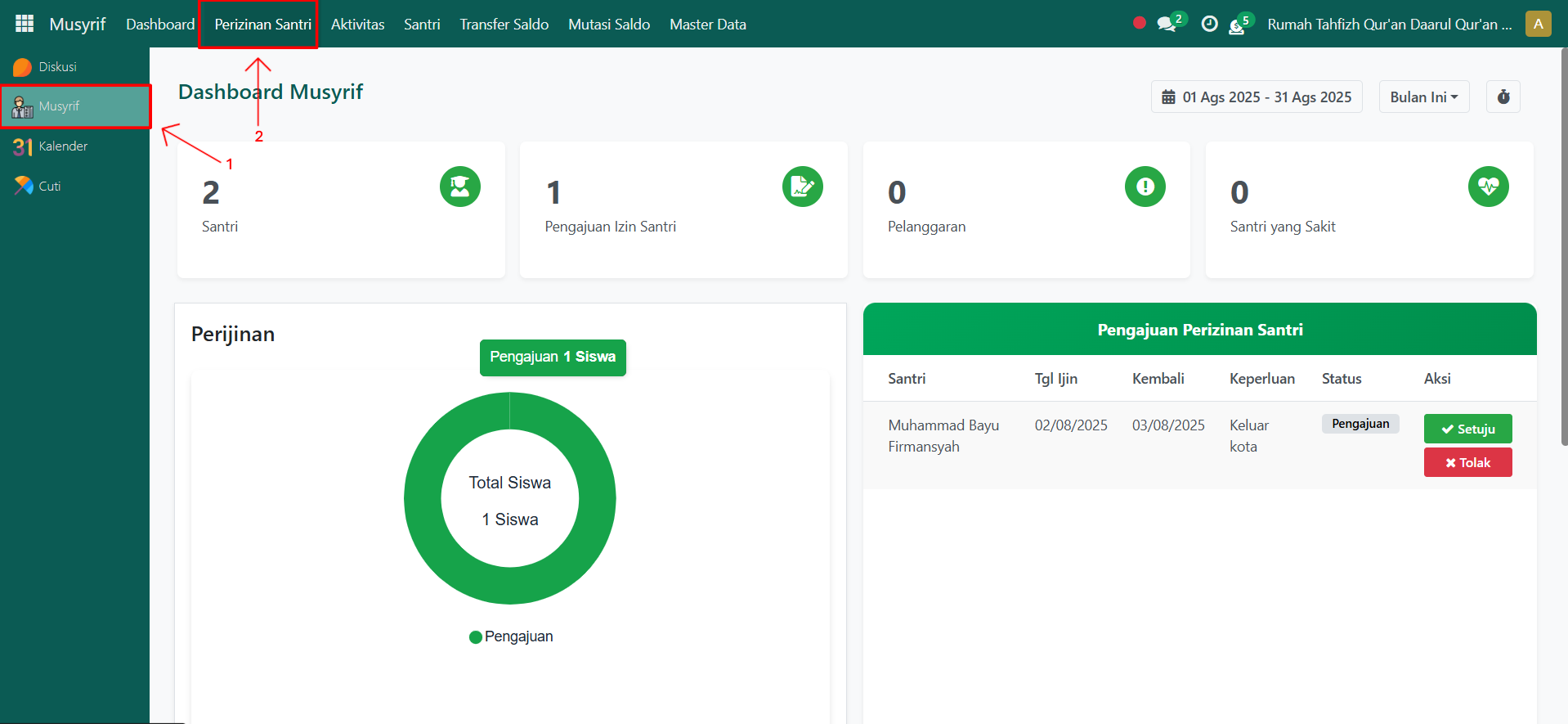 Buka modul Musyrif, klik menu Perizinan Santri.