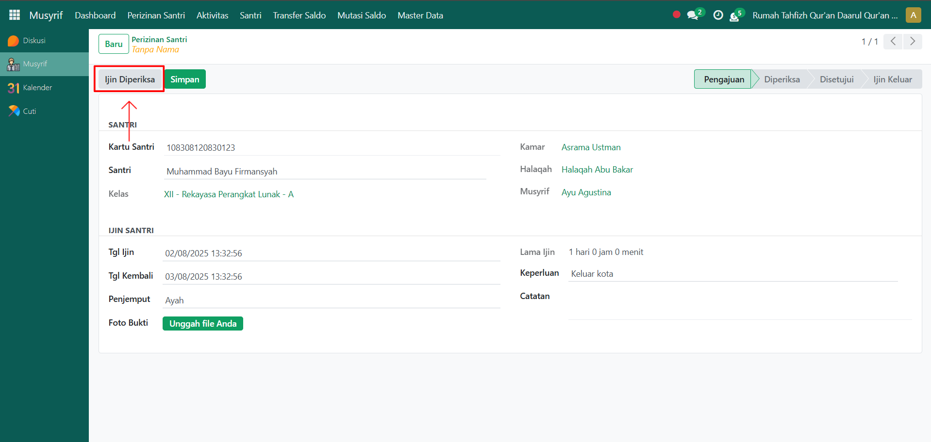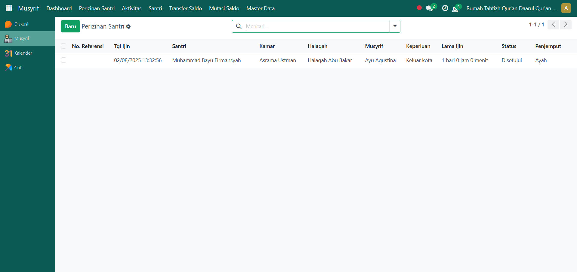 Perizinan santri selesai dikelola dan status akhirnya dapat dipantau pada daftar perizinan santri di modul Musyrif.