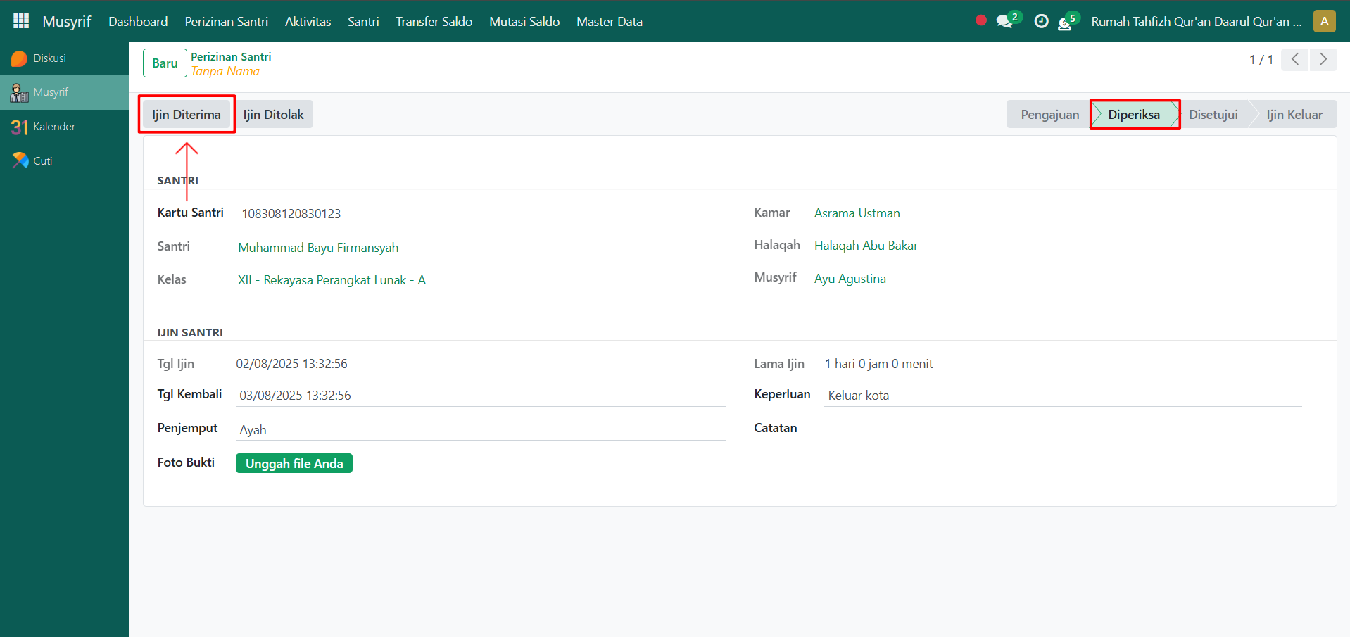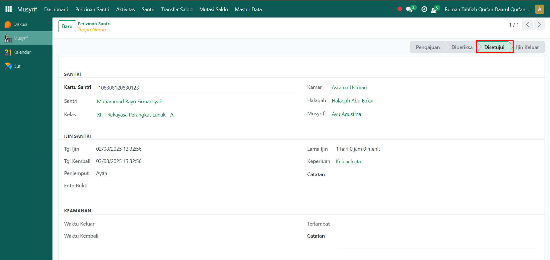 Jika izin disetujui, status perizinan akan otomatis berubah menjadi Disetujui, yang berarti musyrif telah menyetujui izin santri untuk keluar. Sebaliknya jika izin ditolak, maka status perizinan santri akan berubah menjadi Ditolak.