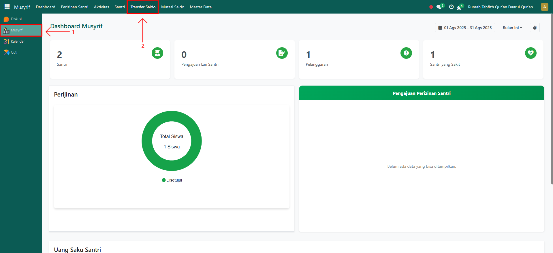 Buka modul Musyrif, lalu klik menu Transfer Saldo.