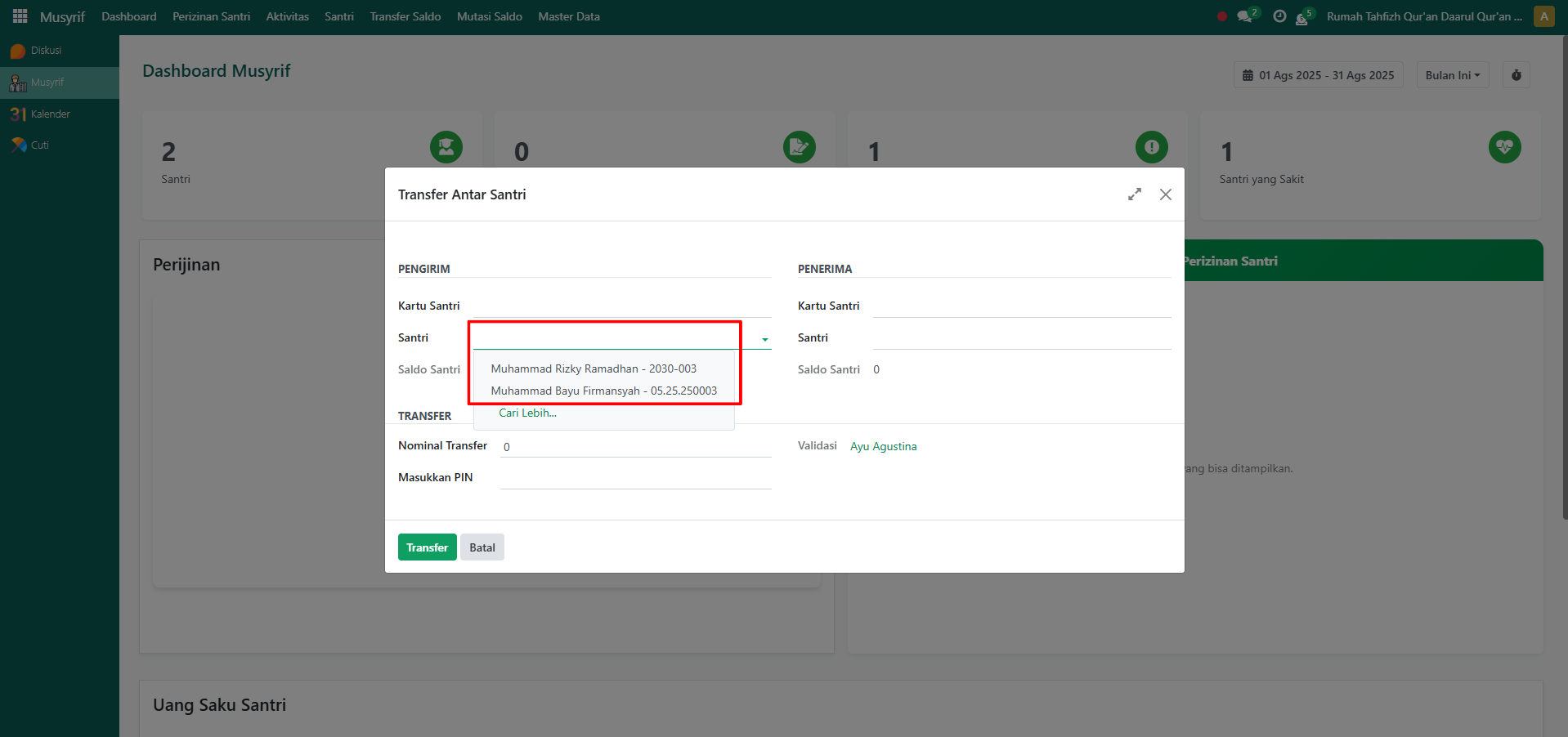 Akan tampil halaman pop up form Transfer Saldo. Pada form ini, pilih santri sebagai pengirim yang akan mengirimkan saldonya ke santri lain.