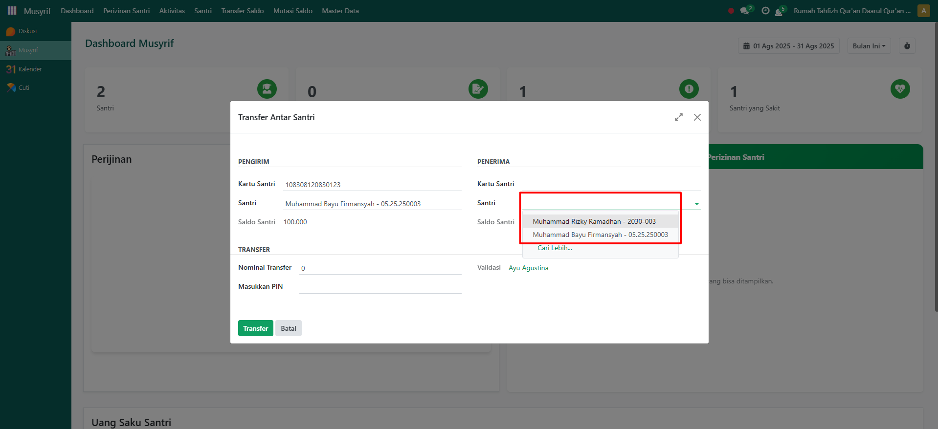 Selanjutnya, pilih santri sebagai penerima yang akan menerima saldo dari santri pengirim.
