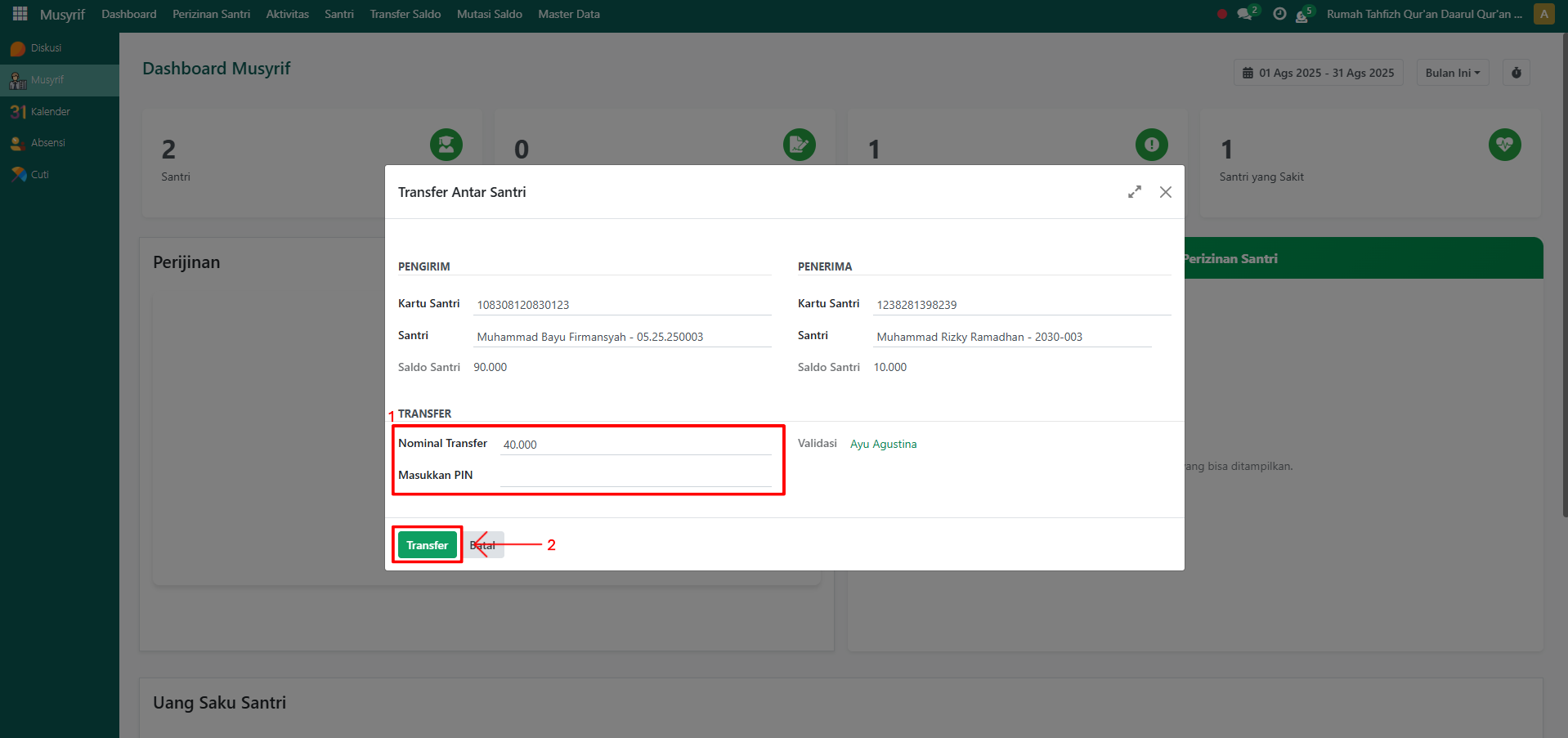 Isi inputan lainnya seperti Nominal Transfer, lalu masukkan PIN Dompet Santri Pengirim untuk otorisasi. Setelah semua inputan selesai diisi dengan benar, klik tombol "Transfer" untuk memproses transfer saldo antar santri.
