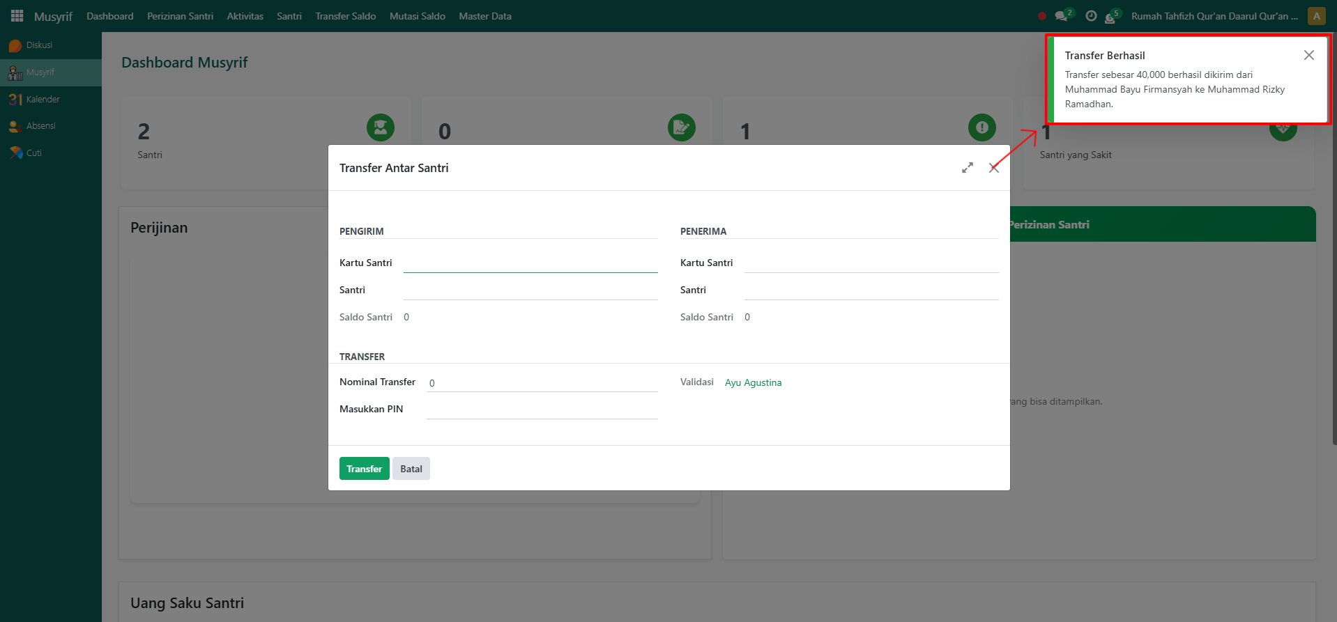 Setelah berhasil, sistem akan memproses transaksi dan menampilkan notifikasi bahwa transfer saldo antar santri berhasil dilakukan.