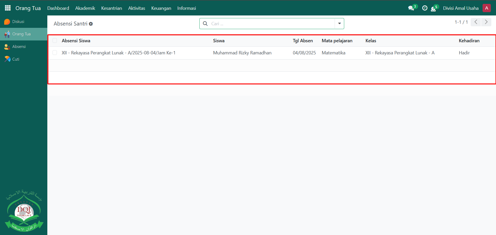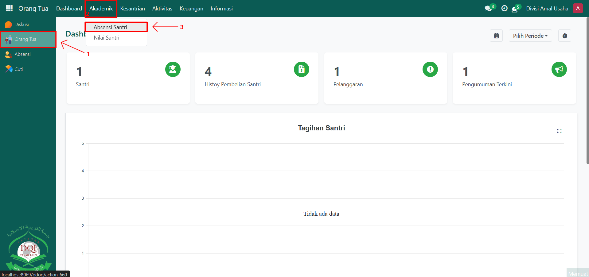 Buka modul Orang Tua, lalu klik menu Akademik kemudian pilih submenu Absensi Santri.