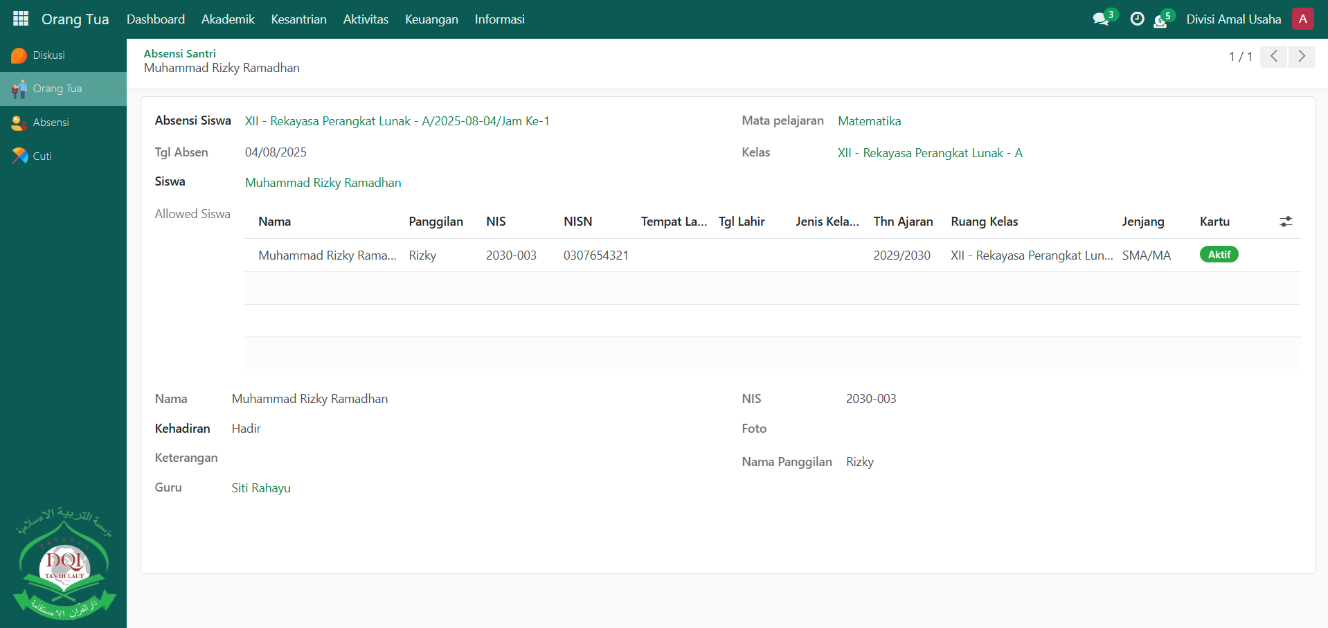 Pada halaman Absensi Santri, sistem akan menampilkan daftar data absensi santri dari anak Anda, berisi informasi kehadiran seperti hadir, izin, sakit, atau alpa. Klik salah satu data absensi untuk melihat detail informasi, misalnya tanggal, mata pelajaran/aktivitas, keterangan, dan guru yang mencatat absensi.