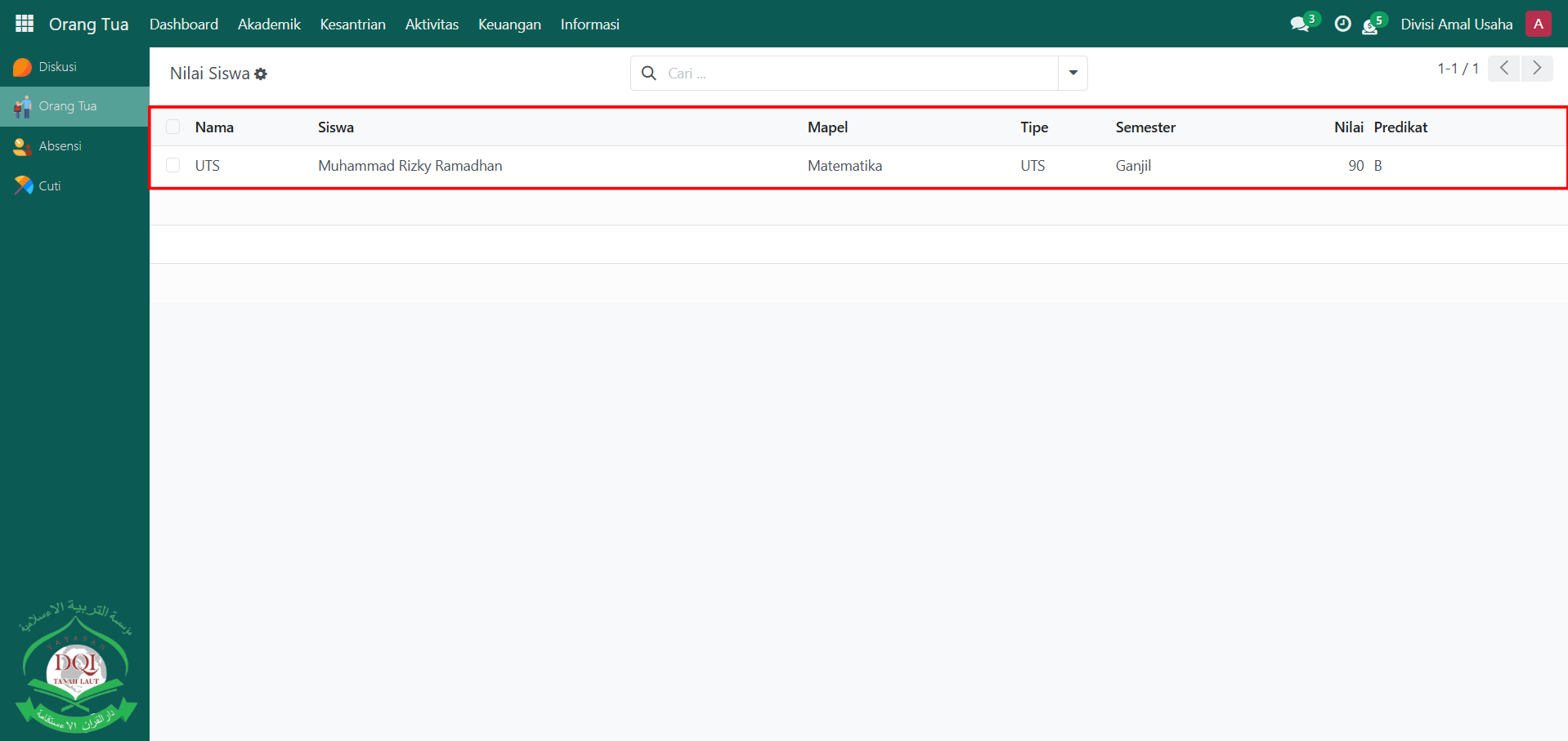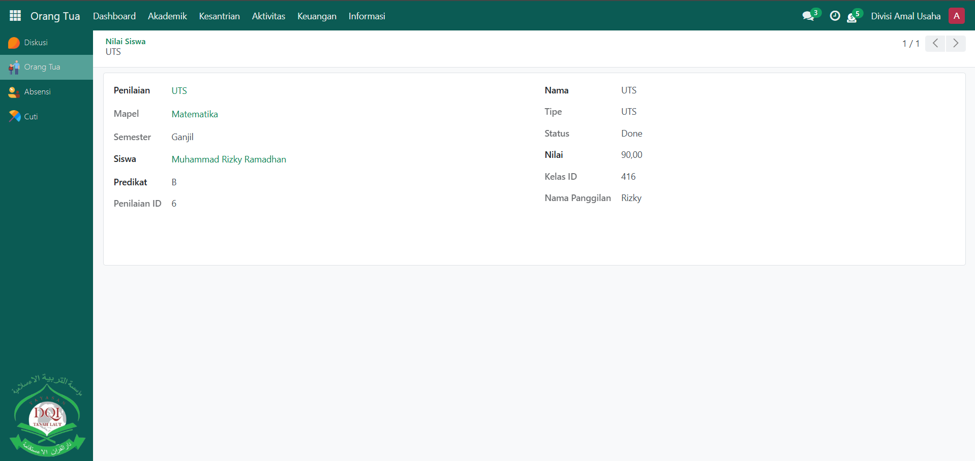 Sistem akan menampilkan daftar nilai santri dari anak Anda, yang berisi informasi seperti mata pelajaran, jenis penilaian (tugas, UTS, UAS, dan lain-lain), serta nilai dan predikat yang diperoleh. Klik salah satu data nilai untuk melihat informasi lebih detail, misalnya nilai per kompetensi, predikat, catatan guru, dan semester.
