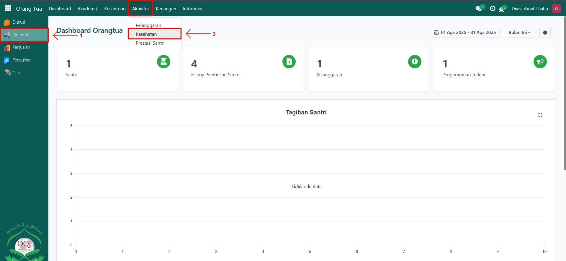 Monitoring Kesehatan Santri digunakan oleh Orang Tua untuk memantau kondisi kesehatan anaknya yang dicatat oleh musyrif atau administrator pesantren. Dengan fitur ini, orang tua dapat mengetahui riwayat pemeriksaan kesehatan, keluhan, tindakan medis, serta perkembangan kesehatan anak secara transparan.