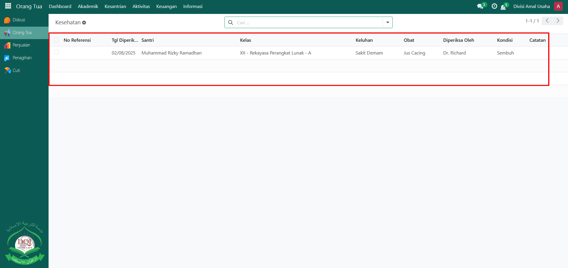 Pada halaman Kesehatan, sistem akan menampilkan daftar catatan kesehatan santri dari anak Anda yang sudah dicatat oleh musyrif atau administrator. Klik salah satu data untuk melihat informasi lebih detail mengenai kondisi kesehatan santri, seperti keluhan, diagnosa, tindakan pemeriksaan, obat/perawatan, catatan ustadz/tenaga medis, serta status kesembuhan.